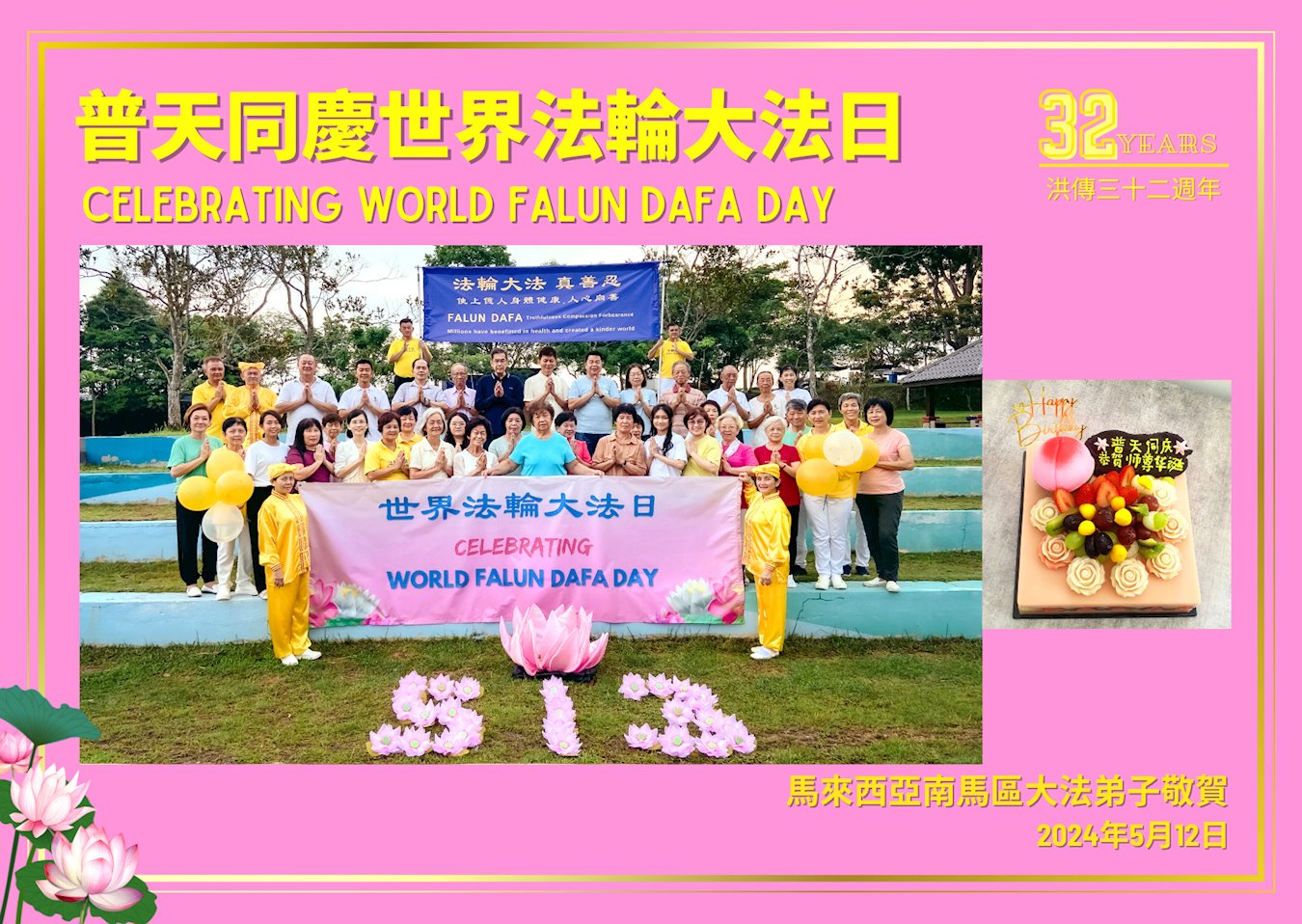 新加坡大法弟子恭祝慈悲伟大的师尊生日快乐!恭贺法轮大法洪传三十二周年!弟子万分感激师尊慈悲救度之恩!