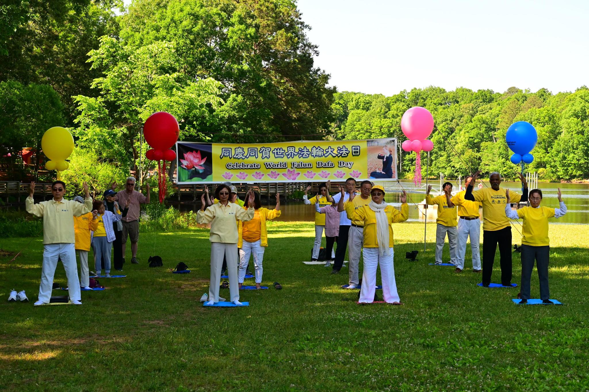 ![]() 图1:二零二四年五月十二日,北卡部分法轮功学员在北卡州凯瑞市的Bond Park集体炼功,庆祝法轮大法弘传32周年。 |