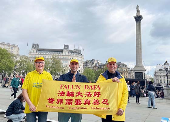 五月十二日,为庆祝5·13第二十五届世界法轮大法日,英国英格兰北部的部分法轮功学员到利物浦弘法,受到当地民众的欢迎