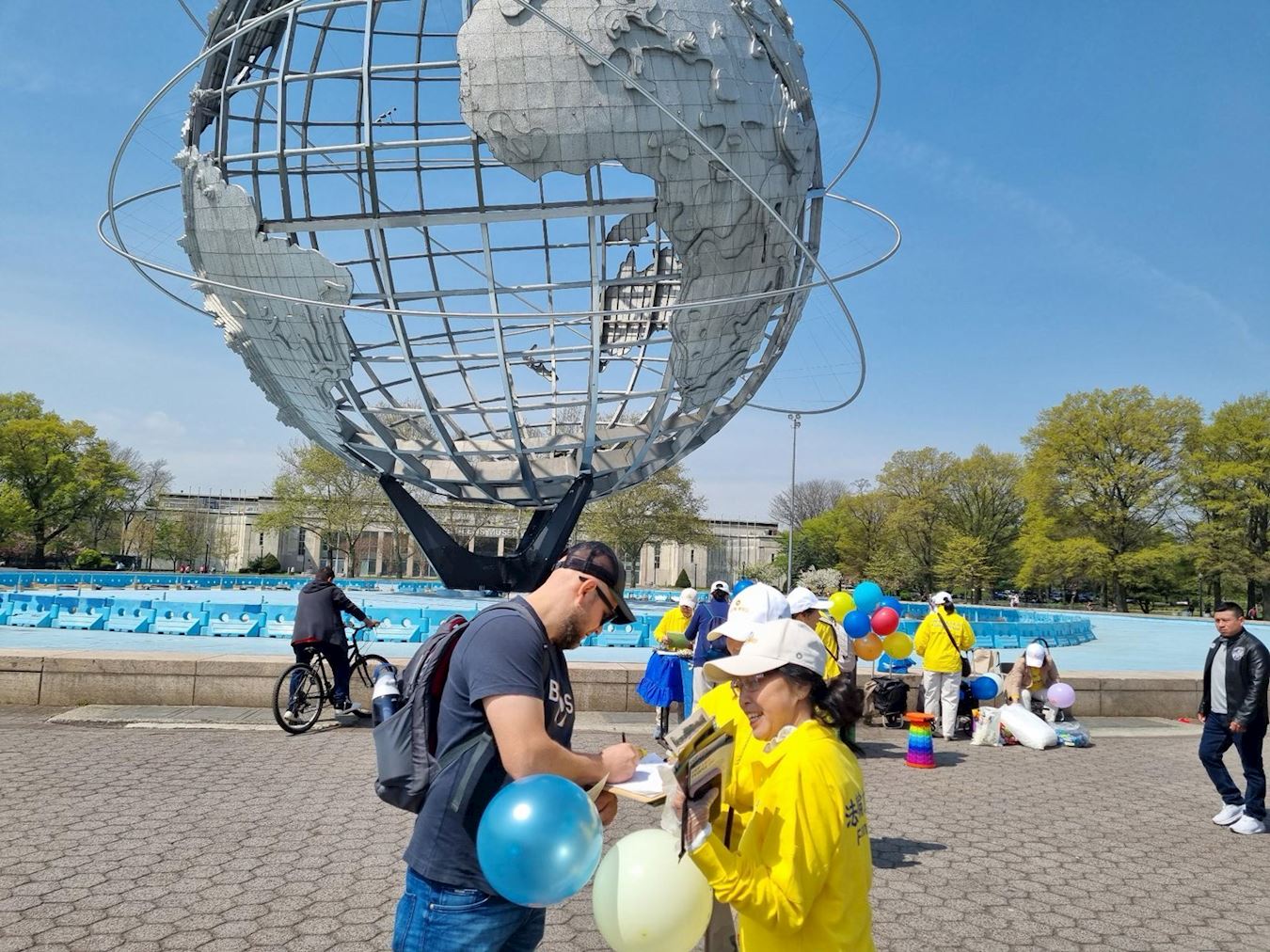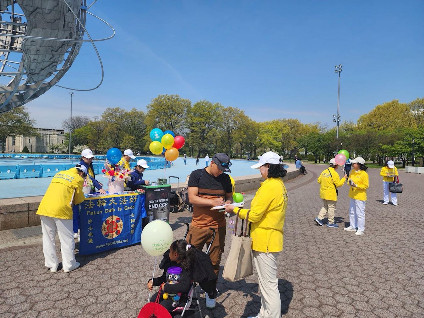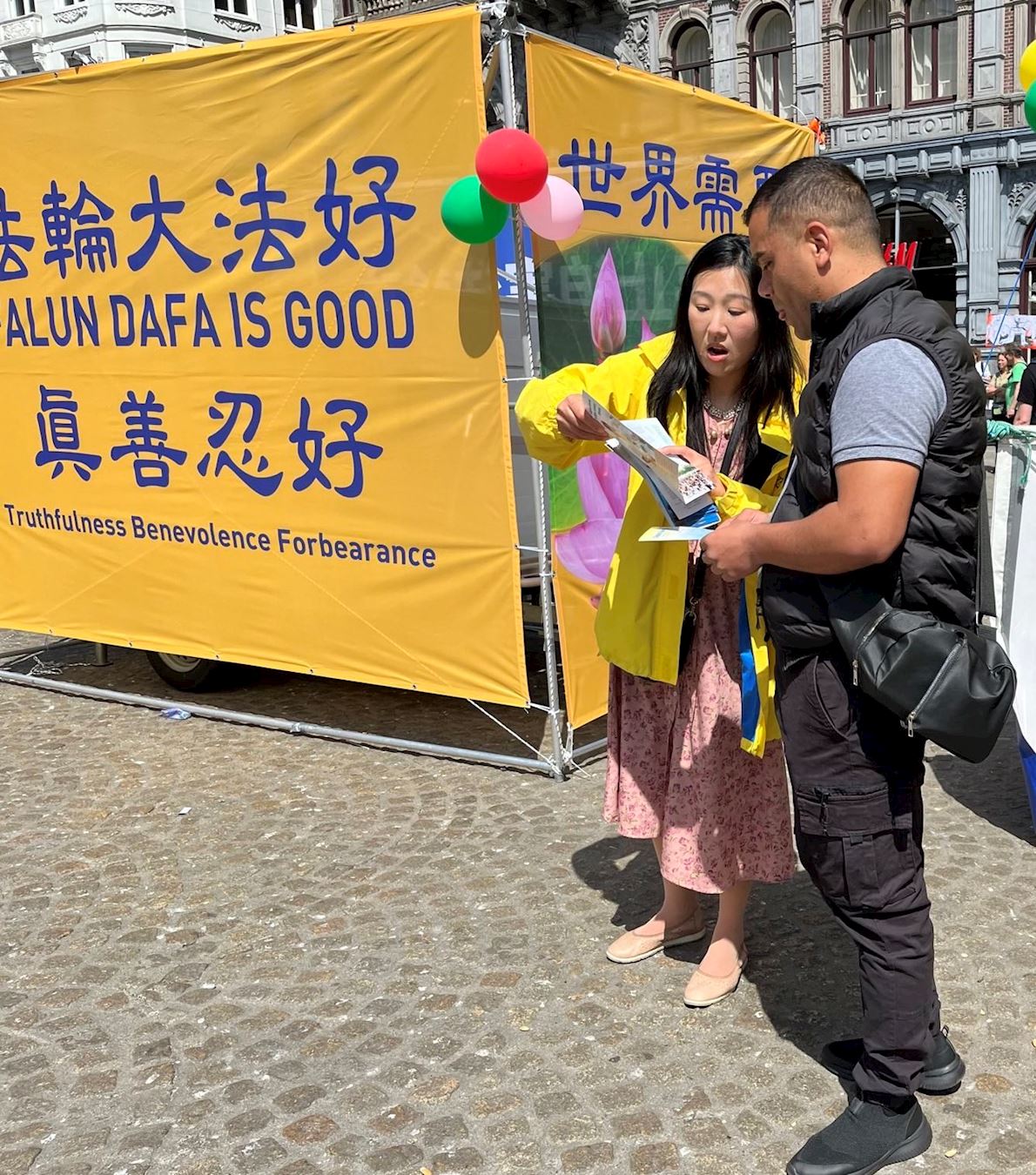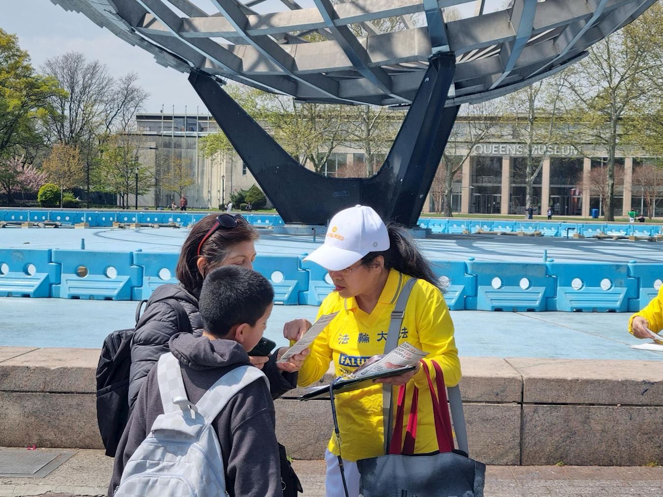 有一位从大陆东北到美国不久的女士说:“我刚刚路过这里看到你们举办歌舞表演,因为有事没看多久,我现在专门回来看。因为在中国不让炼法轮功,我想知道是怎么回事,法轮功是什么?”法轮功学员马上给她一些有关的真相资料,并为她讲了法轮功真相,她非常愿意接受。