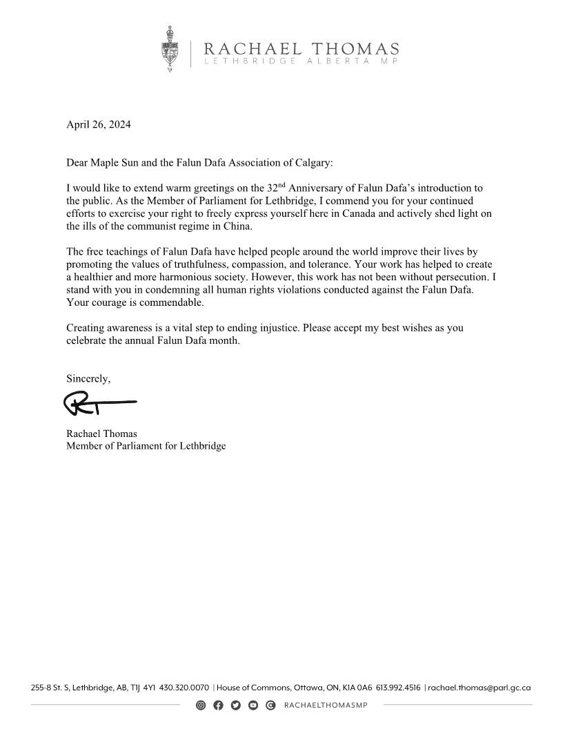 亚省莱斯布里奇市国会议员、联邦影子内阁部长托马斯(Rachael Thomas)赞赏到:“法轮大法的免费教导通过弘扬真、善、忍的价值观,帮助世界各地的人民改善了生活。你们的修炼有助于创建一个更健康、更融洽的社会。然而,你们受到了迫害,我与你们一起谴责一切针对法轮大法的侵犯人权行为。你的勇气值得赞扬!”