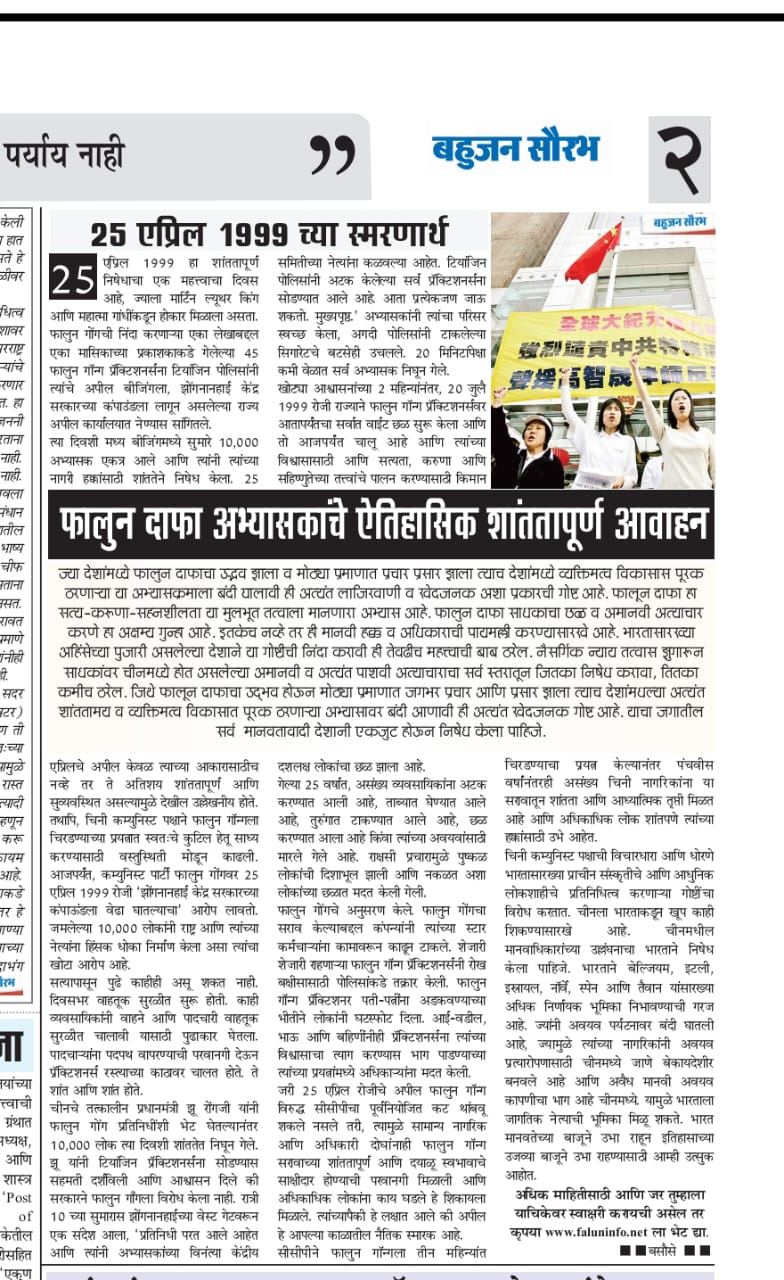 【明慧网二零二四年五月二日】二十五家印度地方新闻媒体报道了中国法轮功学员“四·二五”去北京和平上访二十五周年,旨在让读者们了解这一天在现代历史上意味着什么,为何如此重要,对当今社会具有哪些启迪作用。马拉地语报纸《Daily Bahujan Saurabh》编辑希望越来越多的编辑们不要“保持沉默”,善意关注这一重大事件。