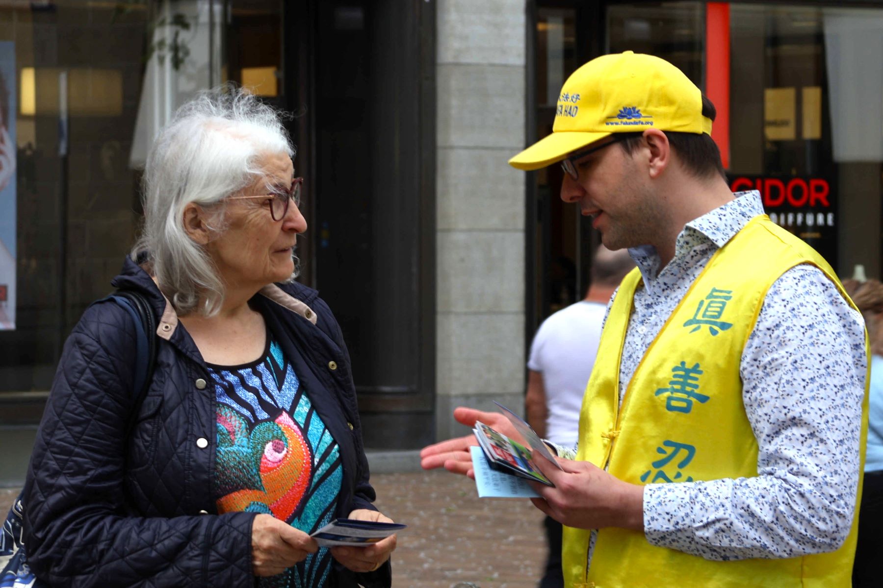 ![]() 图6:行人在接过学员的真相资料后立即仔细阅读。 |