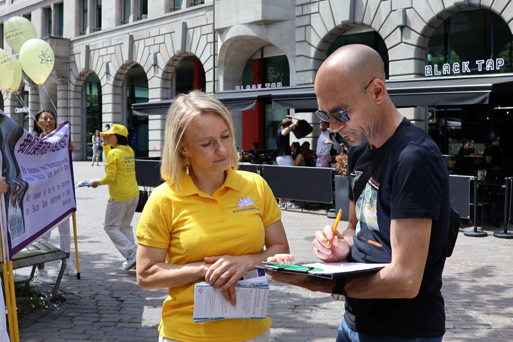 在那阳光灿烂的周六午后,匈牙利人托马斯·佐特(Tamas Czotter)带着书,远远看到一群身着亮丽金黄色衣服的男女老少,正分发给路人的真相传单。他信步走向前说:“遵从内心我来到这里。”在简短交谈后,他签名支持法轮功学员,并谈到:“我希望通过签名能让世界有所改善。让你们(法轮功学员)能获得更多的关注及支持,包括来自政府的。”