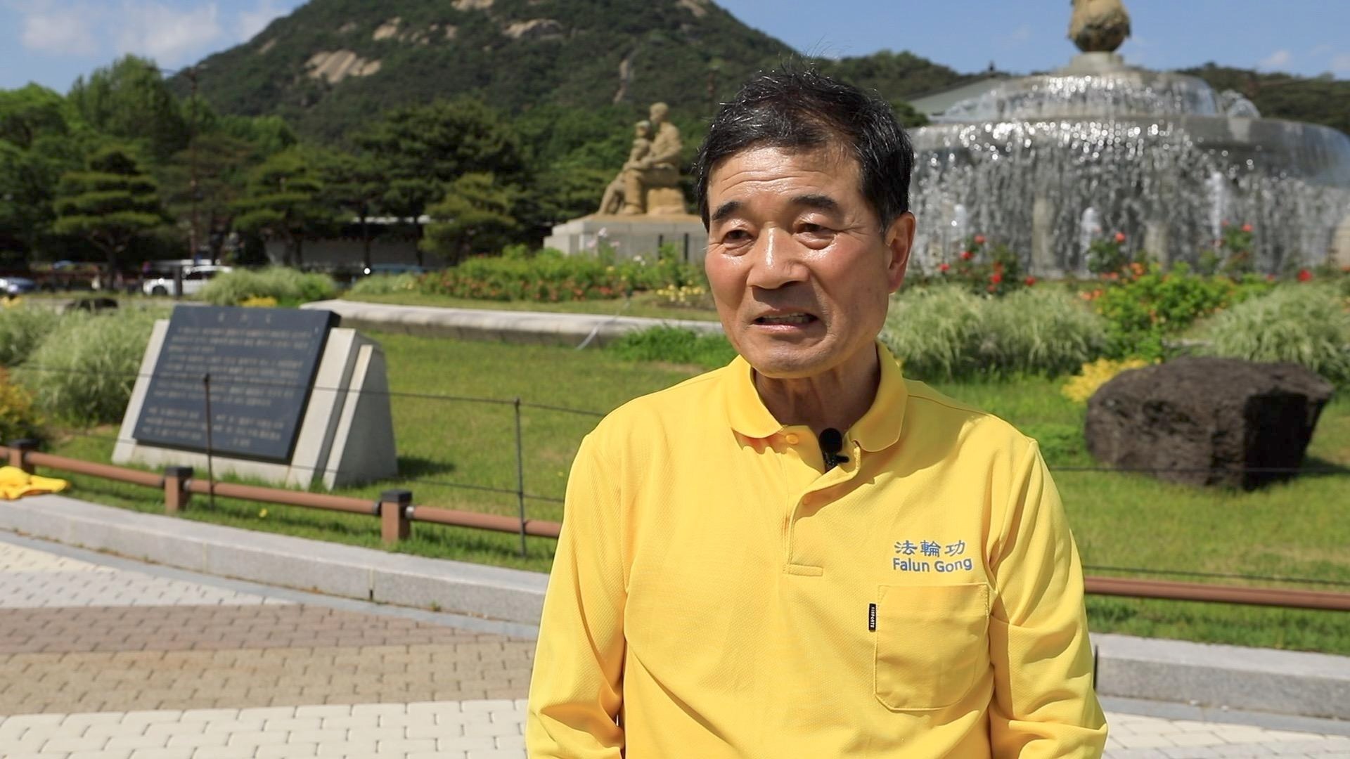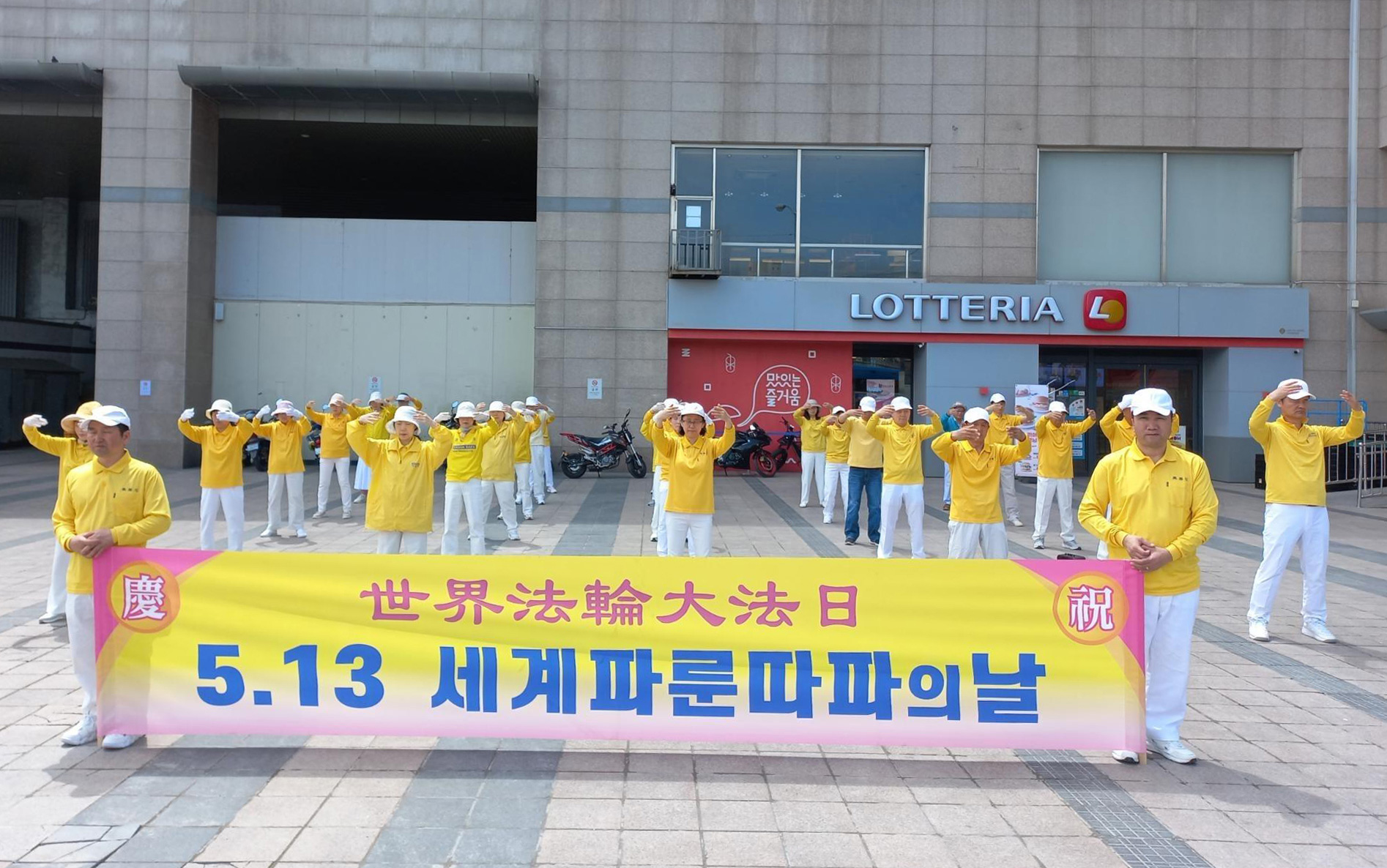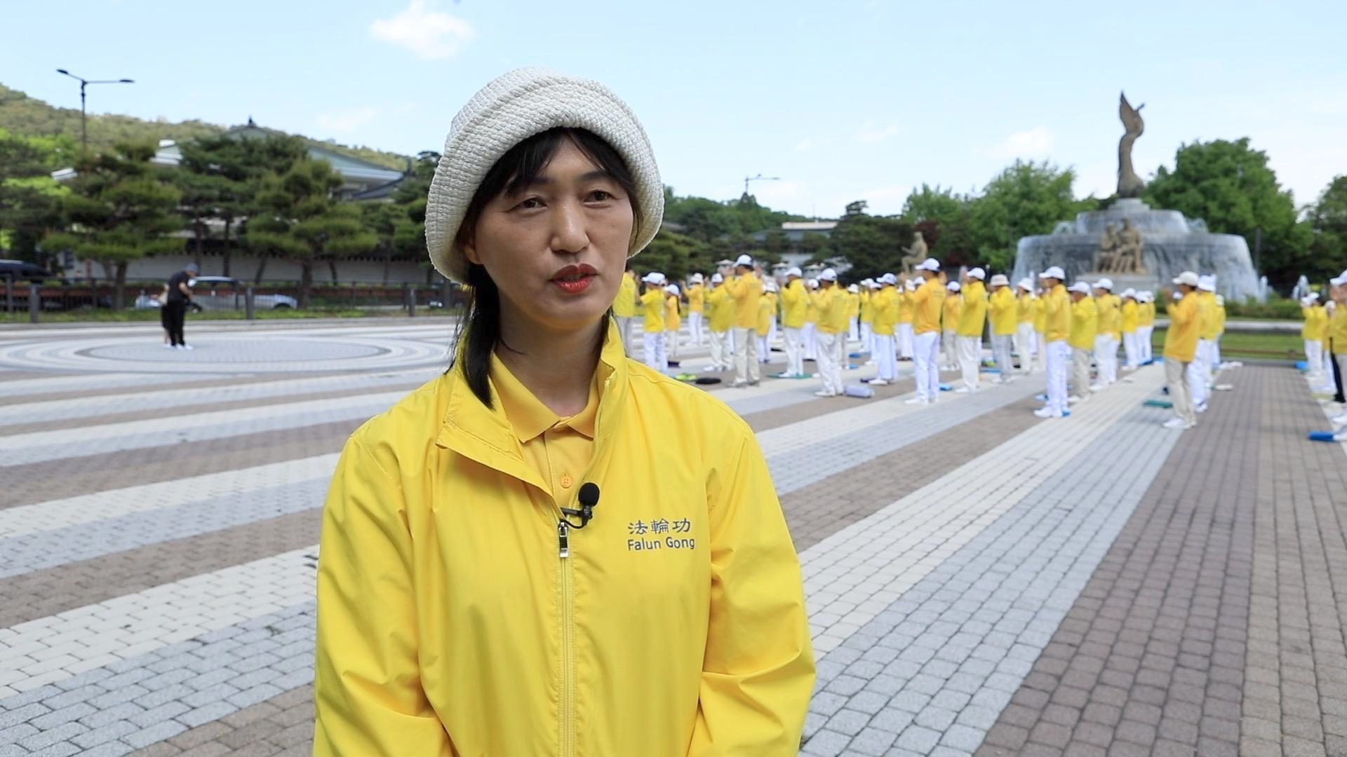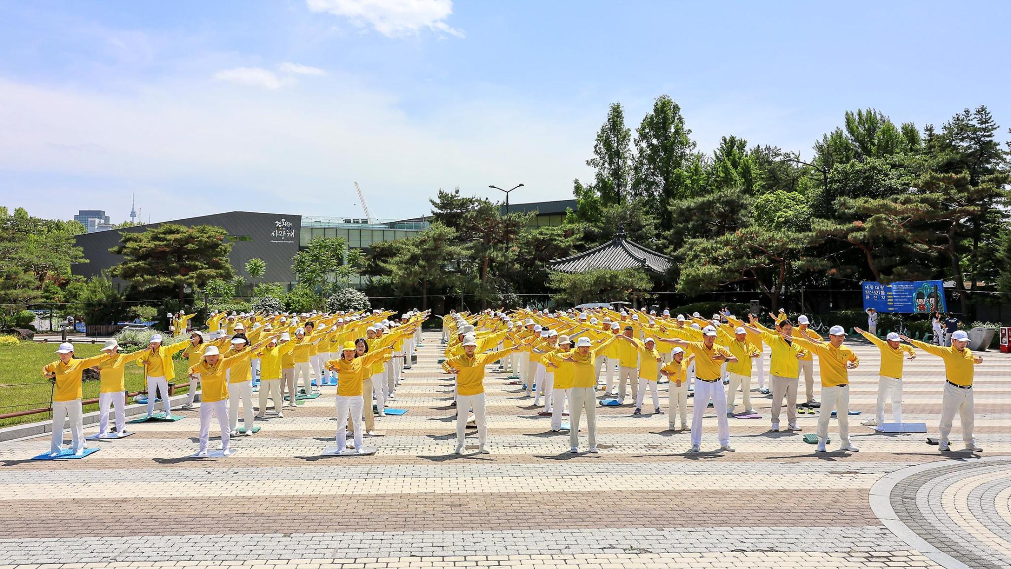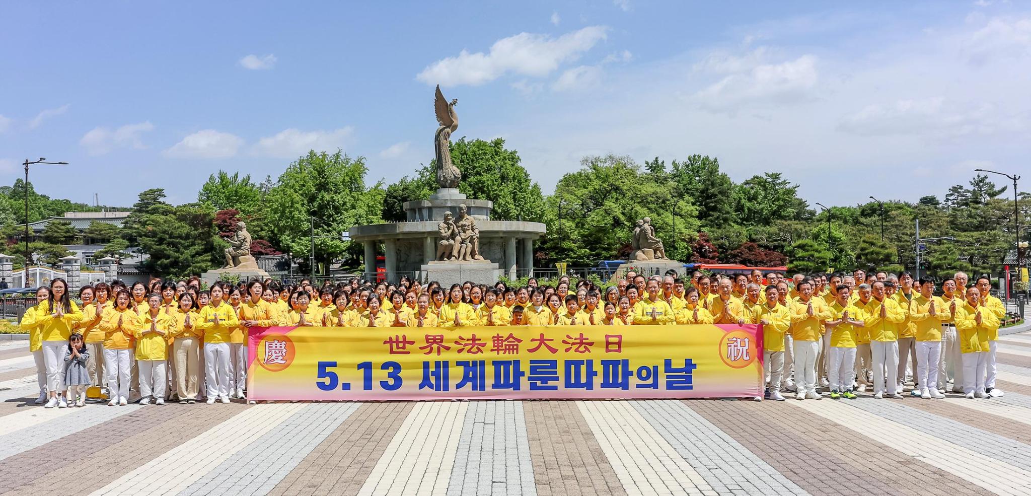 二零二四年神韵艺术团在韩国的演出圆满落幕后的第二天,暨五月十二日,法轮功学员心怀着对师尊的感恩聚集在青瓦台前,举行了庆祝世界法轮大法日及祝贺师尊华诞活动,然后随着祥和的炼功音乐集体炼功。