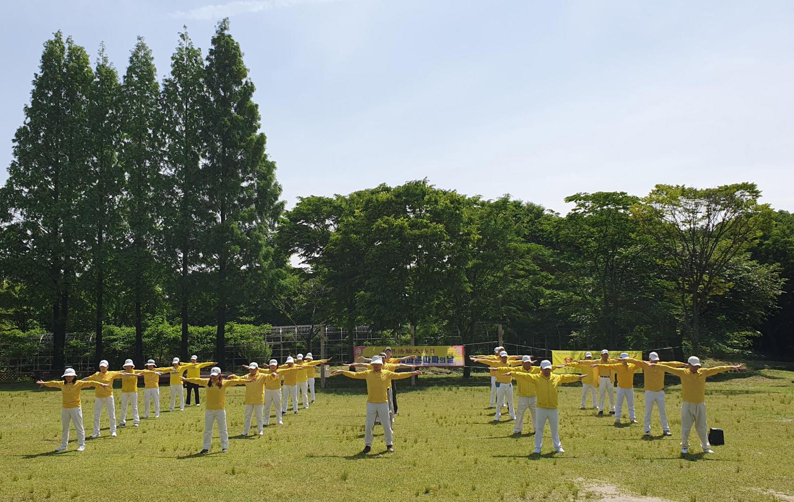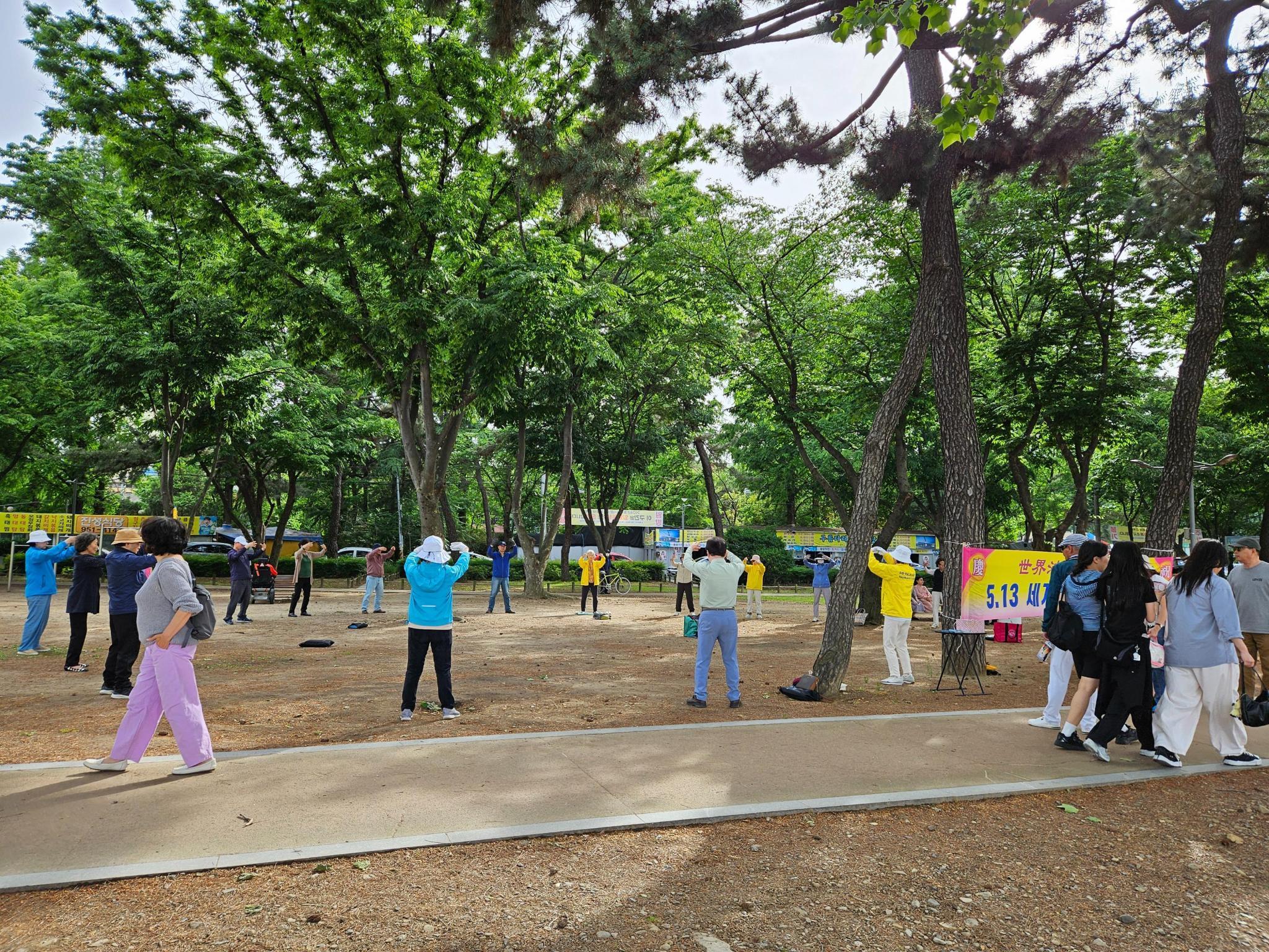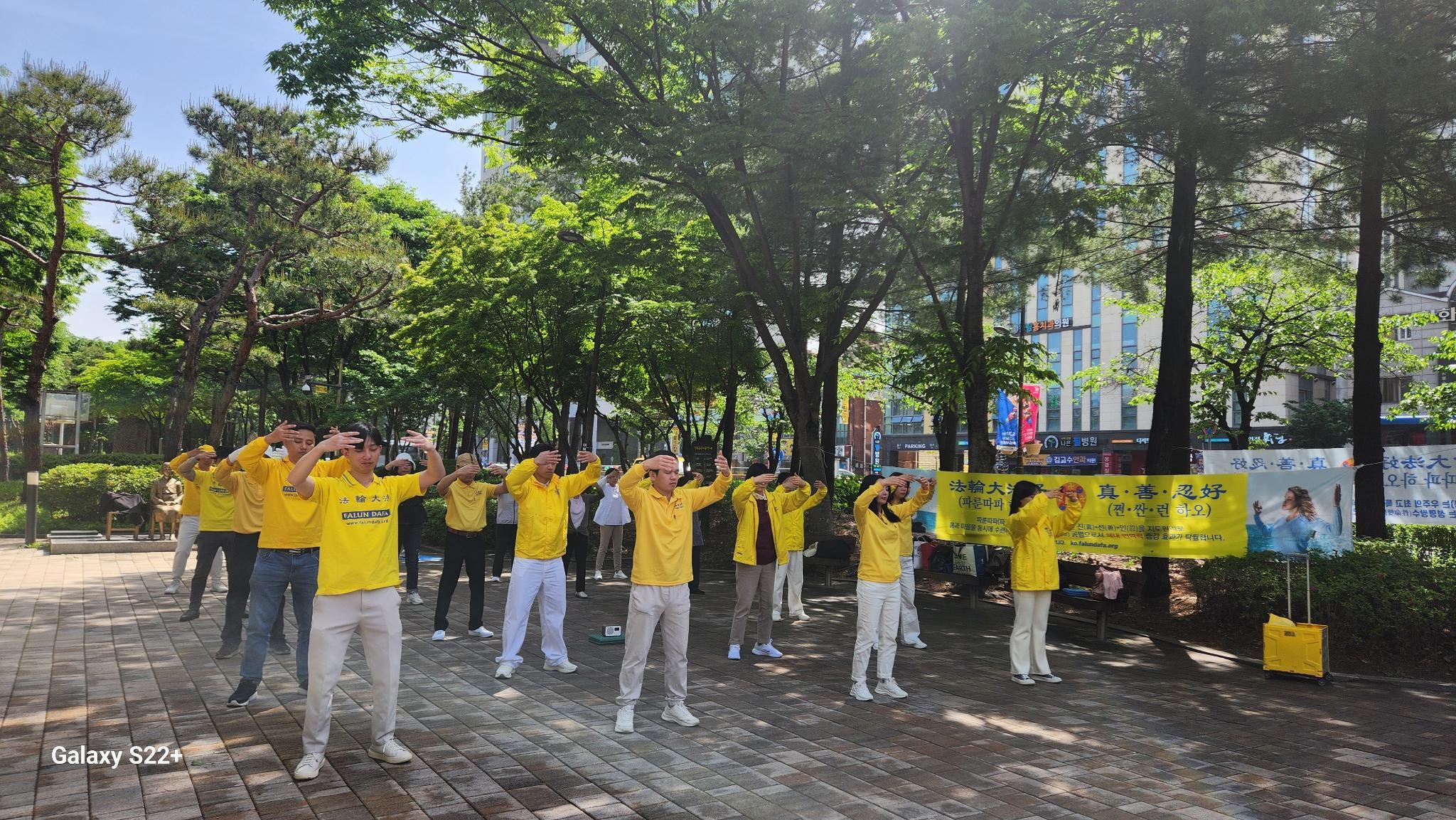 同一时间,韩国其它地区也举行集体炼功活动。五月十二日当天,在水原、安养、安山、一山、昌原、釜山、大邱、蔚山、光州、大田、清州、天安、金海、江原、光州、湖南等地的法轮功学员们在各地举行了集体炼功活动。