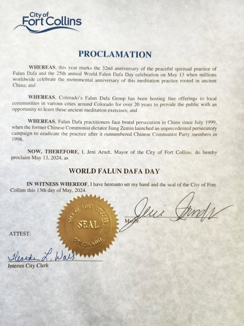 因此,现在,我,柯林斯堡市市长杰尼·阿恩特,特此宣布二零二四年五月十三日为世界法轮大法日。