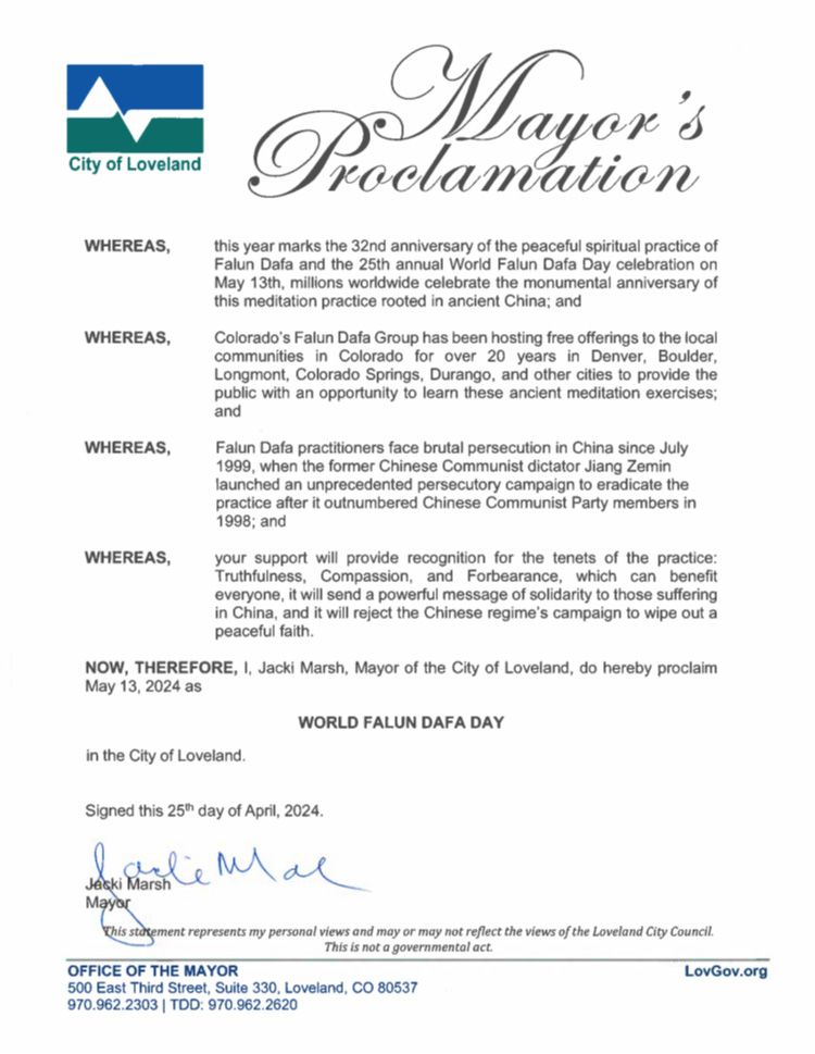 我,拉夫兰市市长杰基·马什特此宣布在拉夫兰市二零二四年五月十三日为世界法轮大法日。