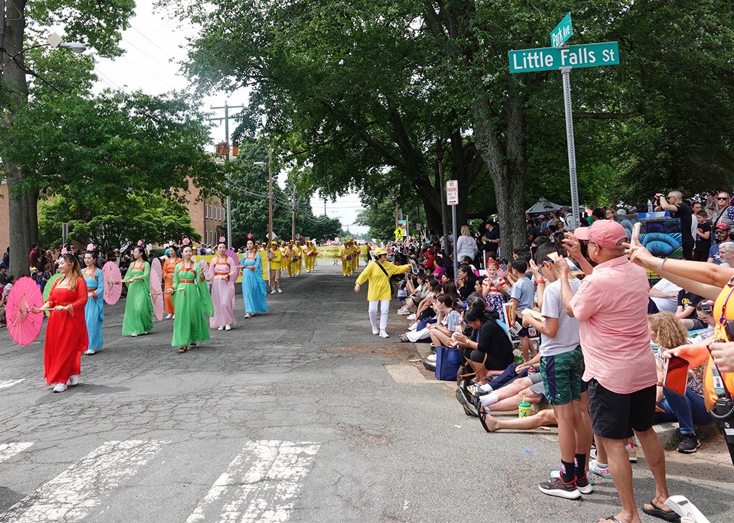 图1~5:二零二四年五月二十七日下午,大华府地区部份法轮功学员再次参加了华盛顿近郊弗吉尼亚州瀑布教堂市(Falls Church)的阵亡将士纪念日游行。图为:法轮功学员的游行队伍。
