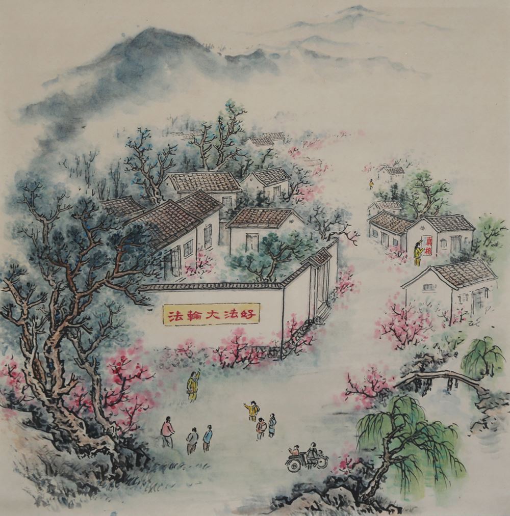 描述,几名法轮功学员到偏远的山村子里,向村民们讲述法轮大法好的真相,告诉他们诚心敬念:“法轮大法好,真善忍”,得福报,天赐平安。
