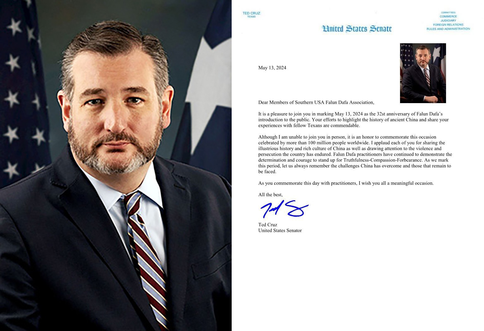 ![]() 图5:美国联邦参议员泰德·克鲁斯(Ted Cruz)给美南法轮大法学会发来贺信。 |