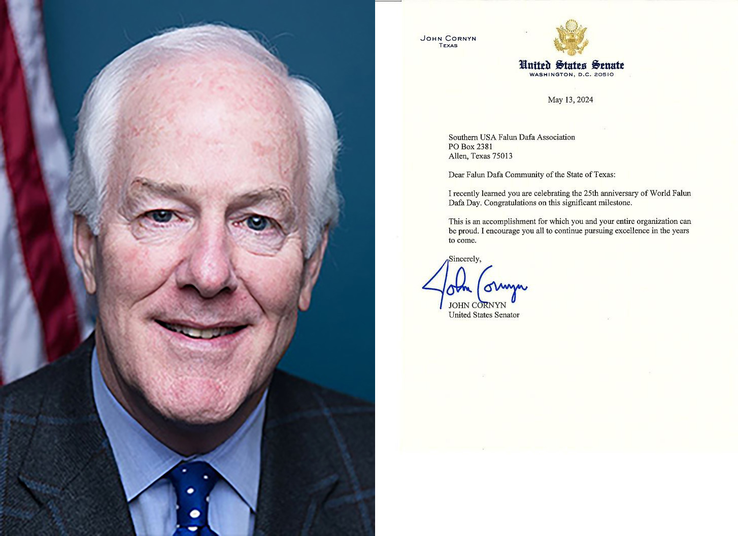 德克萨斯州的两位共和党籍联邦参议员泰德·克鲁斯(Ted Cruz)和约翰·康宁(John Cornyn)分别给美南法轮大法学会发来贺信,祝贺“世界法轮大法日”这个特殊的日子。