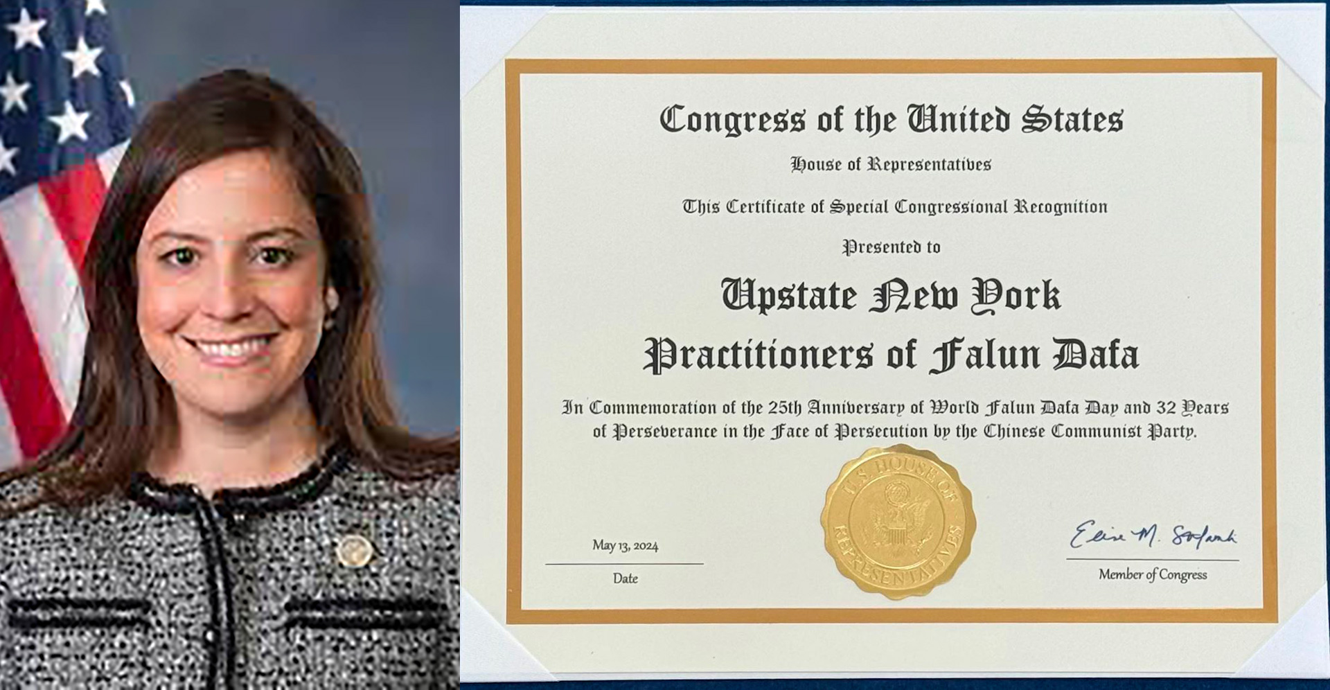 国会众议院多数党领袖(共和党党团会议主席)、纽约州联邦众议员埃莉斯·斯特凡尼克(Elise Stefanik)向纽约上州法轮大法修炼者,颁发了美国国会特别褒奖令,“以纪念第二十五届世界法轮大法日,暨法轮大法学会在中共迫害之下坚守二十五周年。”
