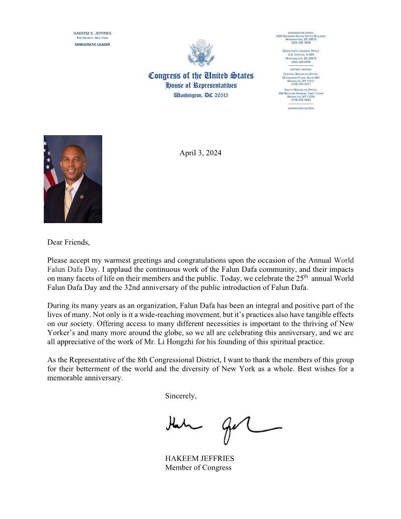 国会众议院少数党领袖(民主党党团会议主席)、纽约州民主党籍联邦众议员哈基姆·杰弗里斯(Hakeem Jeffries)发来贺信表示:“我为法轮大法(修炼)群体的持续努力,及他们对于其成员和公众生活多方面的积极影响而喝彩。”