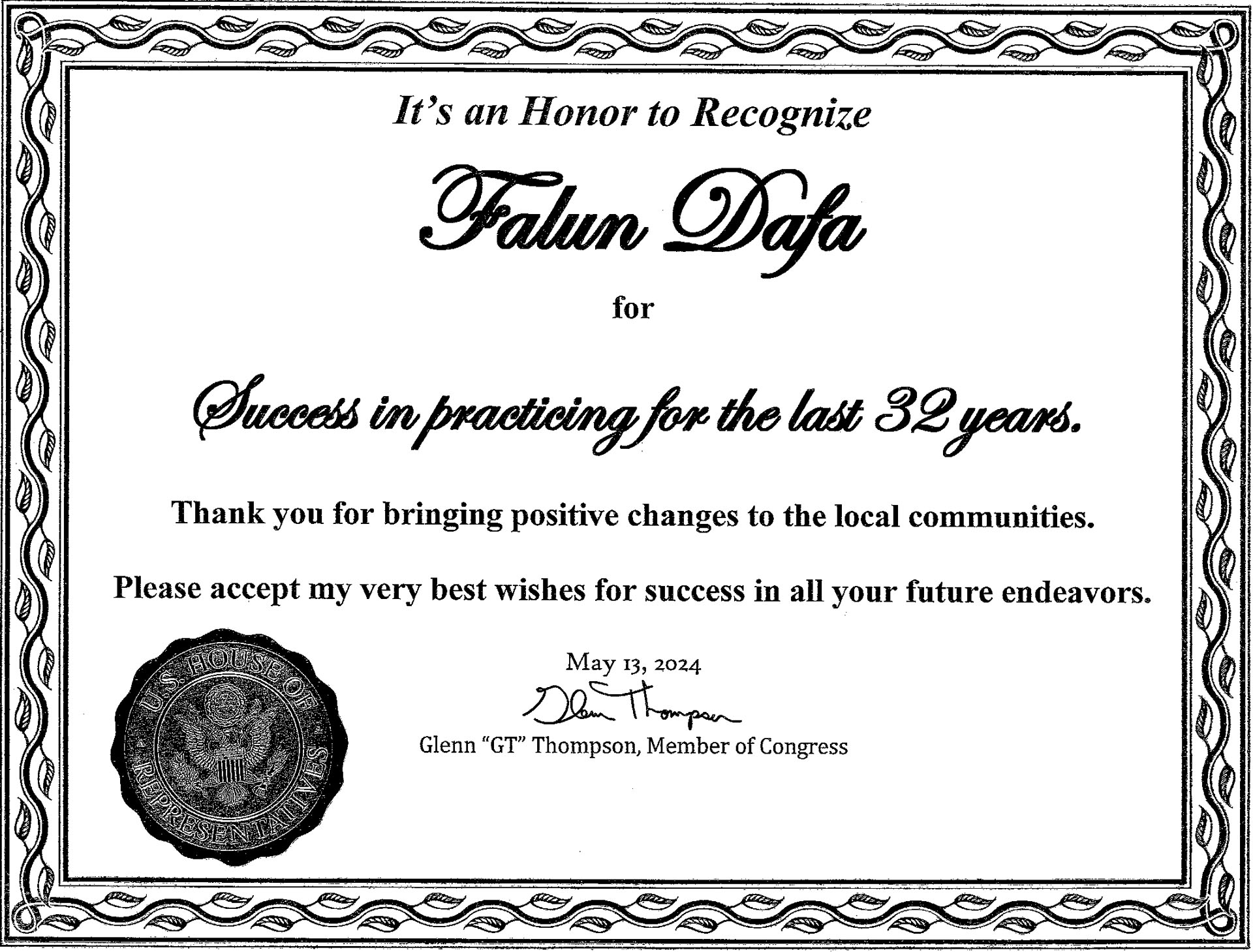宾夕法尼亚州联邦众议员格伦‧汤普森(Glenn Thompson)在法轮大法日当天颁发荣誉证书,表彰法轮大法。他写道:“很荣幸能表彰法轮大法在过去三十二年中的成功实践。感谢你们给当地社区带来的积极变化。”