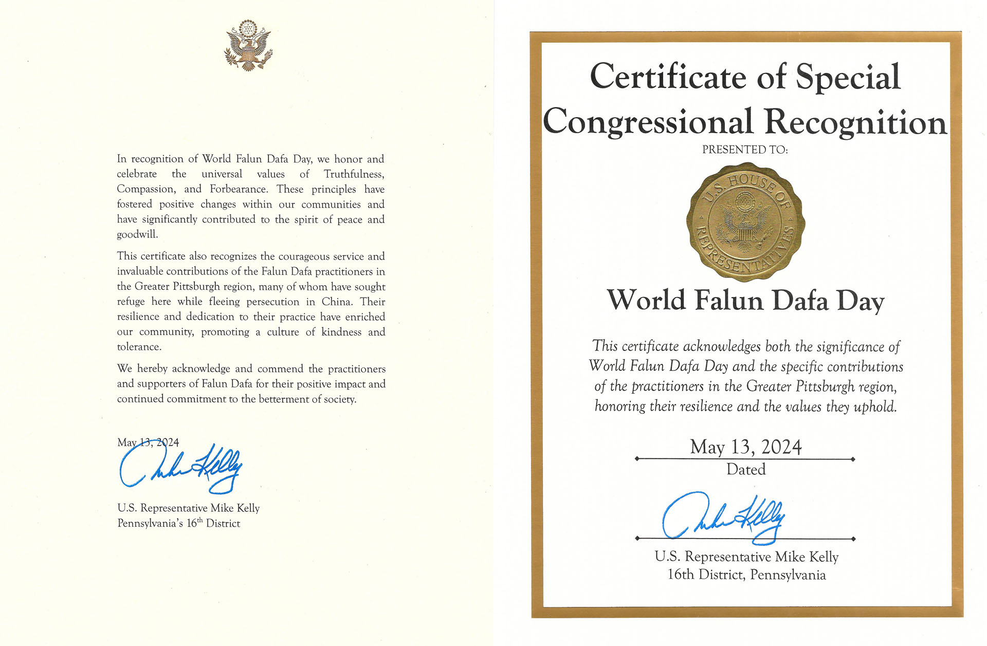 宾夕法尼亚州联邦众议员迈克·凯利(Mike Kelly)颁发国会特别证书,写道:“在庆祝世界法轮大法日之际,我们颂扬并庆祝真、善、忍的普世价值。这些价值观给我们的社区带来了积极影响,对和平与友善精神做出了重大贡献。”