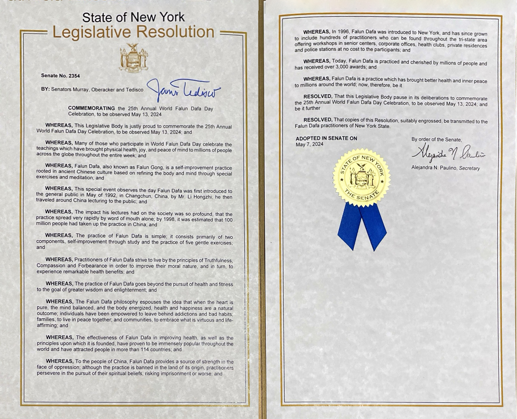 二零二四年五月七日,纽约州参议院全体通过第2354号决议案,恭贺“二零二四年五月十三日,第二十五届世界法轮大法日的庆典”。这是纽约州参议院连续第十二年通过决议案,表彰世界法轮大法日。