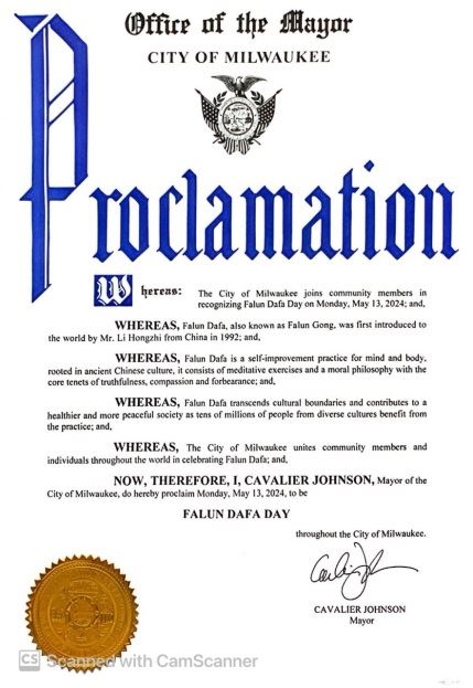 因此,密尔沃基市议会在此宣布二零二四年五月十三日为密尔沃基法轮大法日,并感谢威斯康星法轮大法协会引起对法轮大法修炼的关注。”