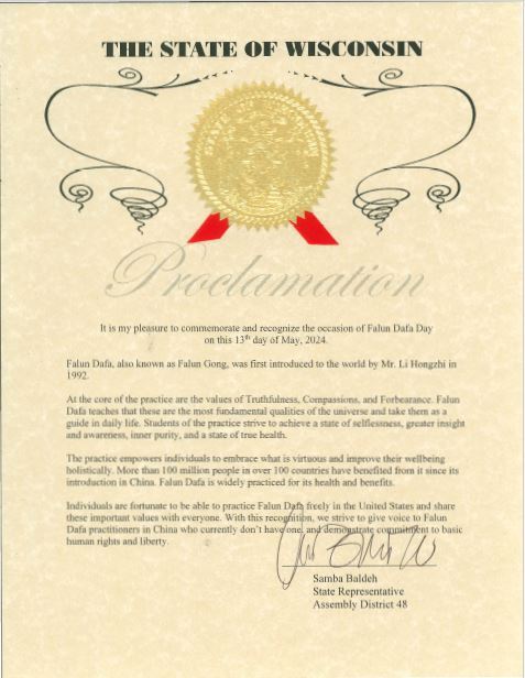 威斯康星州议员桑巴·巴尔德也发来了褒奖,为“在中国无法发声的法轮大法修炼者发声”。他说,“我很荣幸在二零二四年五月十三日纪念和庆祝法轮大法日。