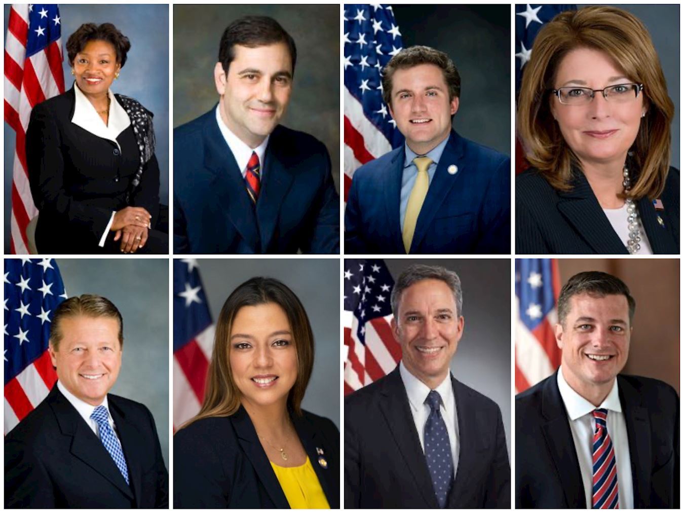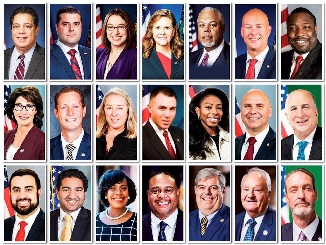 (上排左起):第35选区州参议员安德烈埃・斯图尔特-考辛斯(Andrea Stewart-Cousins)、第24选区州参议员安德鲁・兰萨(Andrew J.Lanza)、第42选区州参议员詹姆斯・司库菲斯(James Skoufis)、第54选区州参议员帕梅拉・赫尔明(Pamela A.Helming)、第60选区州参议员帕特里克・加利文(Patrick M.Gallivan)、第4选区州参议员莫妮卡・马丁内斯(Monica R.Martinez)、第7选区州参议员杰克・马丁(Jack Martins)、第43选区州参议员杰克・阿什比(Jake Ashby)