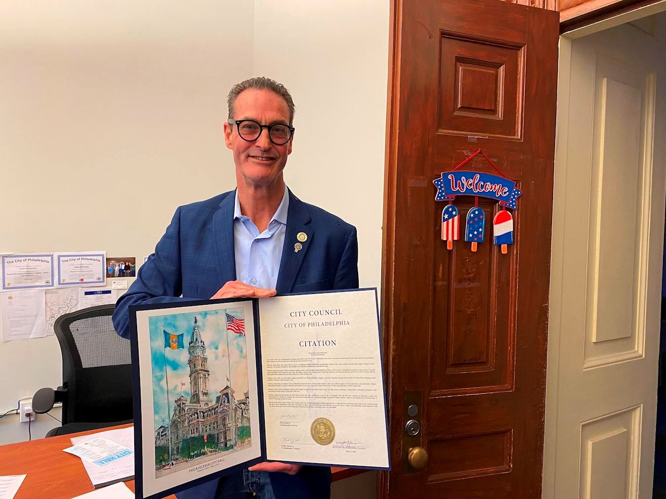 五月十一日,大费城地区法轮功学员在著名历史景点自由钟独立广场举办庆祝世界法轮大法日集会,费城市议员马克・斯奎拉(Mark Squilla)来到庆祝现场,他表示,正如市议会褒奖上写的表彰李洪志先生弘传法轮大法,让全社会受益无穷。(李洪志先生)不仅给了费城人,而且给了全世界人这个机会能够建立那种内心的平静,不仅在费城,而且在宾州和整个国家推广(法轮大法)。”
