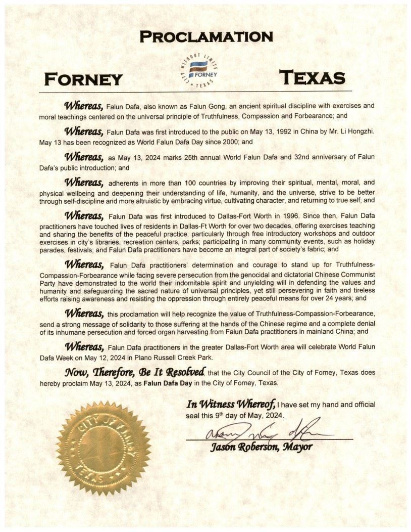 德克萨斯州达拉斯地区六个城市颁发褒奖,宣布这一天为自己城市的法轮大法日。