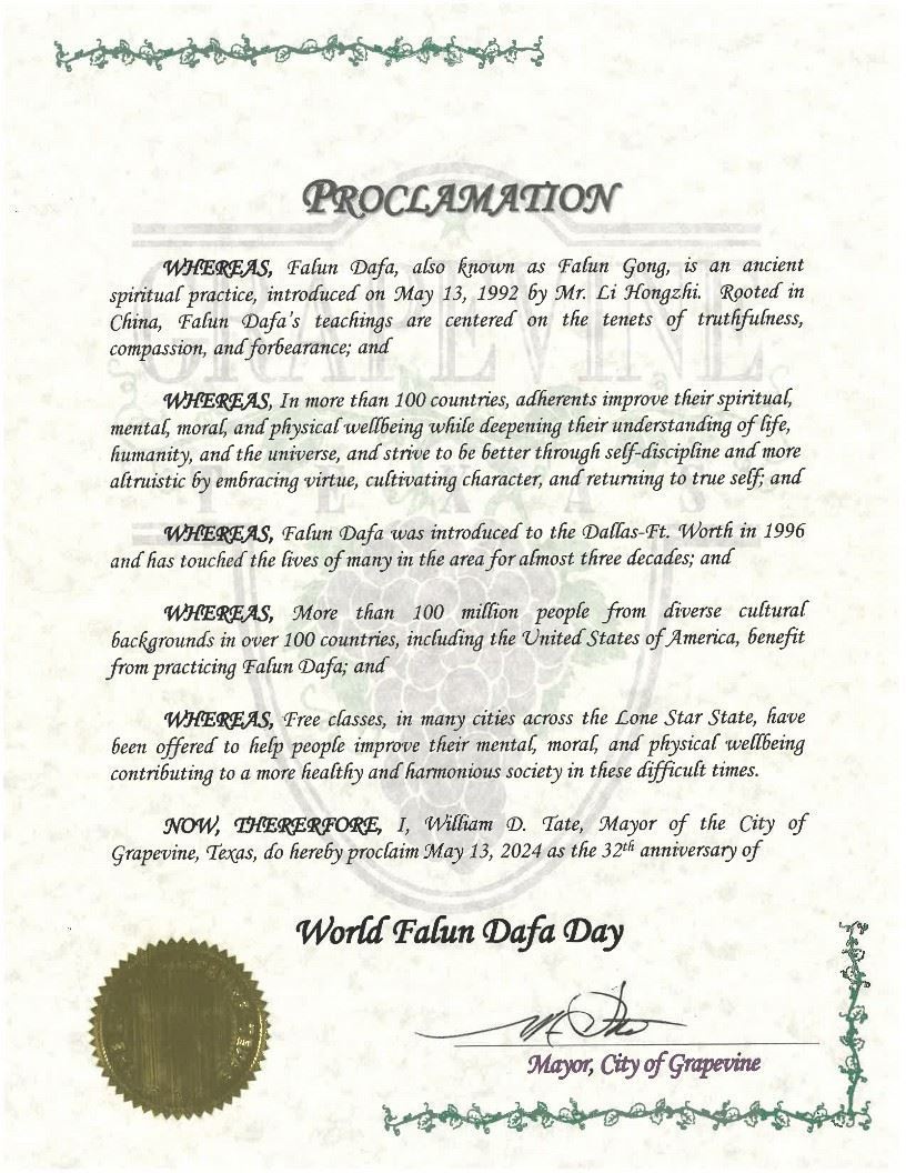 德州众议员颁发决议信达拉斯六市长宣布“法轮大法日”