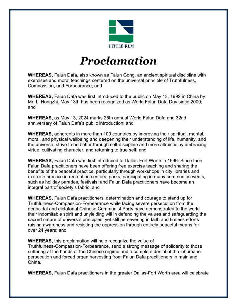 二零二四年五月,美国德克萨斯州众议员杰西·杰顿(Jacey Jetton)颁发决议信,祝贺第二十五届世界法轮大法日,他赞扬法轮大法为美国和世界各地所做的贡献,并向中国的法轮大法修炼者致敬。