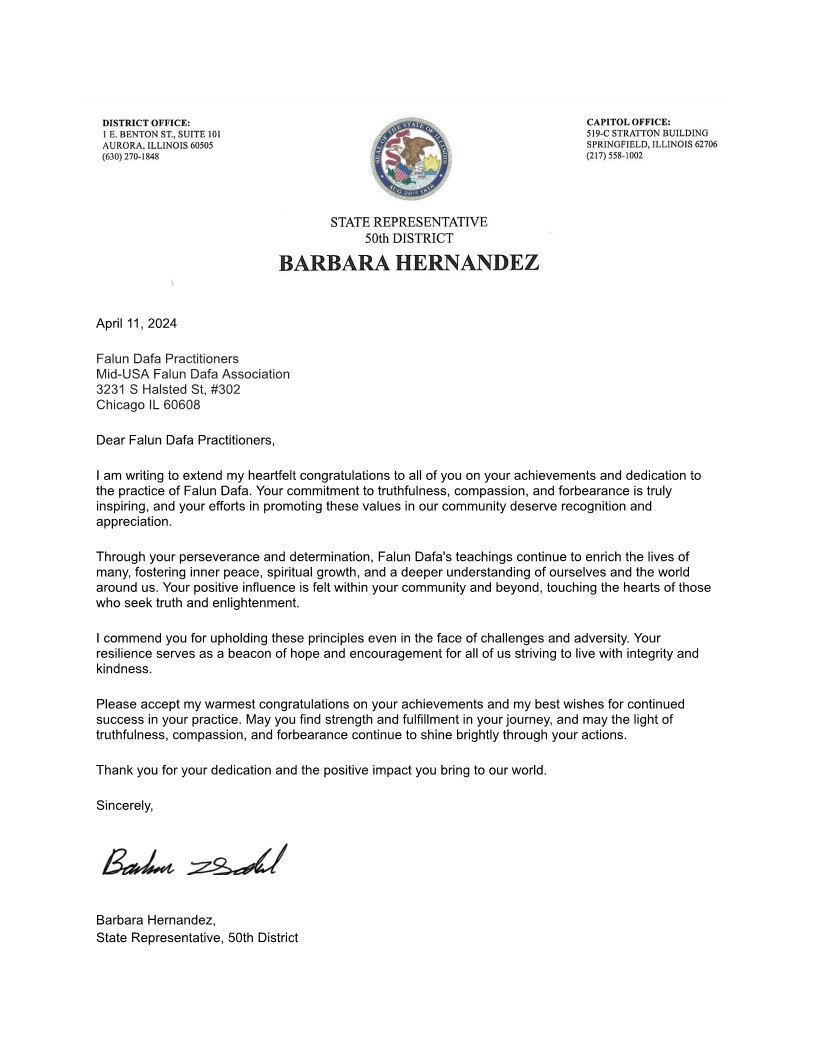 伊利诺伊州的州多数党副领袖州,众议员芭芭拉・埃尔南德斯(Barbara Hernandez)向法轮功学员致贺信。她说:“我赞扬你们即使面对挑战和逆境也坚持这些原则。你们的韧性是我们所有人努力诚信生活的希望和鼓励的灯塔。”“感谢你们的奉献以及给我们的世界带来的积极影响。”