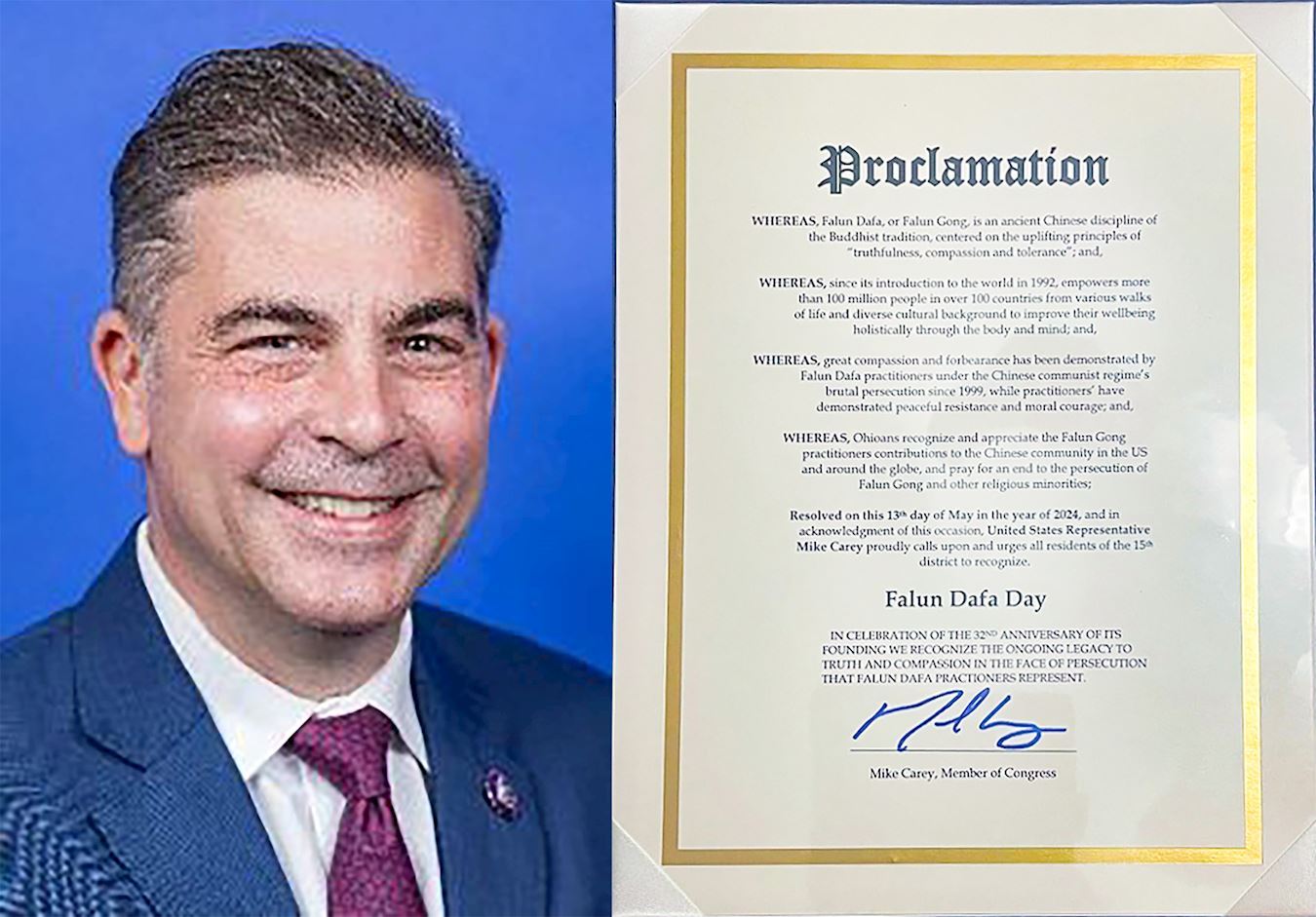 俄亥俄州议员麦克・凯里(Mike Carey),以及伊格尔伍德市市长凯茜・麦克格雷尔(Cathy McGrail)、皮克林顿市市长李・格雷(Lee A.Gray)、代顿市市长小杰弗里・米姆斯(Jeffrey J.Mims Jr.)、梅森市市长戴安娜・纳尔逊(Diana K.Nelson)、希利亚德市议会主席辛西娅・弗米利恩(Cynthia Vermillion)宣布五月十三日为“法轮大法日”。