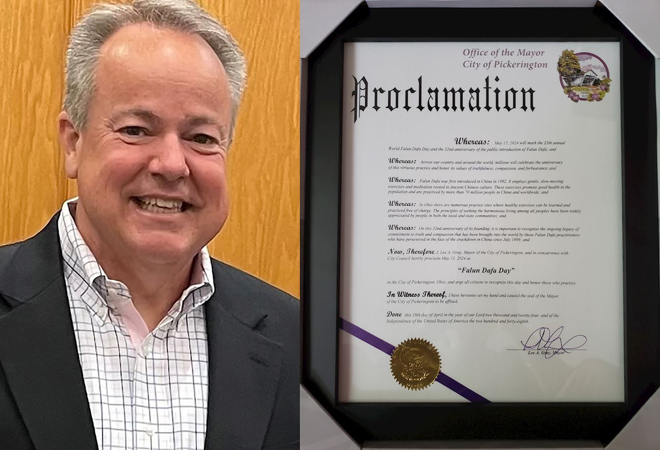 ![]() 图29:皮克林顿市市长李・格雷(Lee A.Gray)及他颁发的“法轮大法日”褒奖令 |