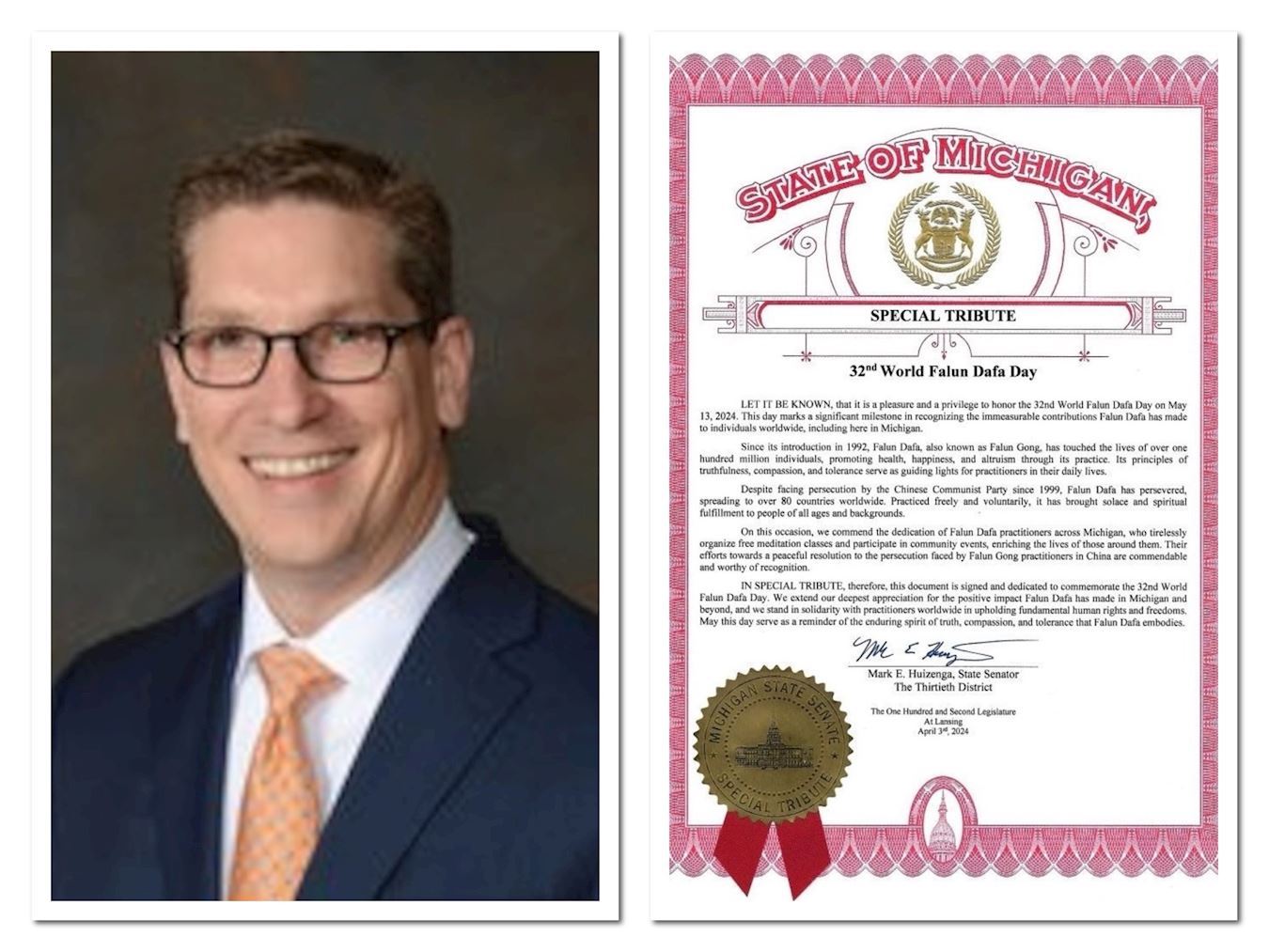 二零二四年四月,美国密西根州参议员马克・休伊曾加(Mark E.Huizenga)颁发“特别褒奖令”,他表示:“二零二四年五月十三日是第二十五届世界法轮大法日,我感到非常高兴和荣幸。这一天标志着对法轮大法在全球范围内,包括密西根州,所作出的不可估量的贡献的重要里程碑。”