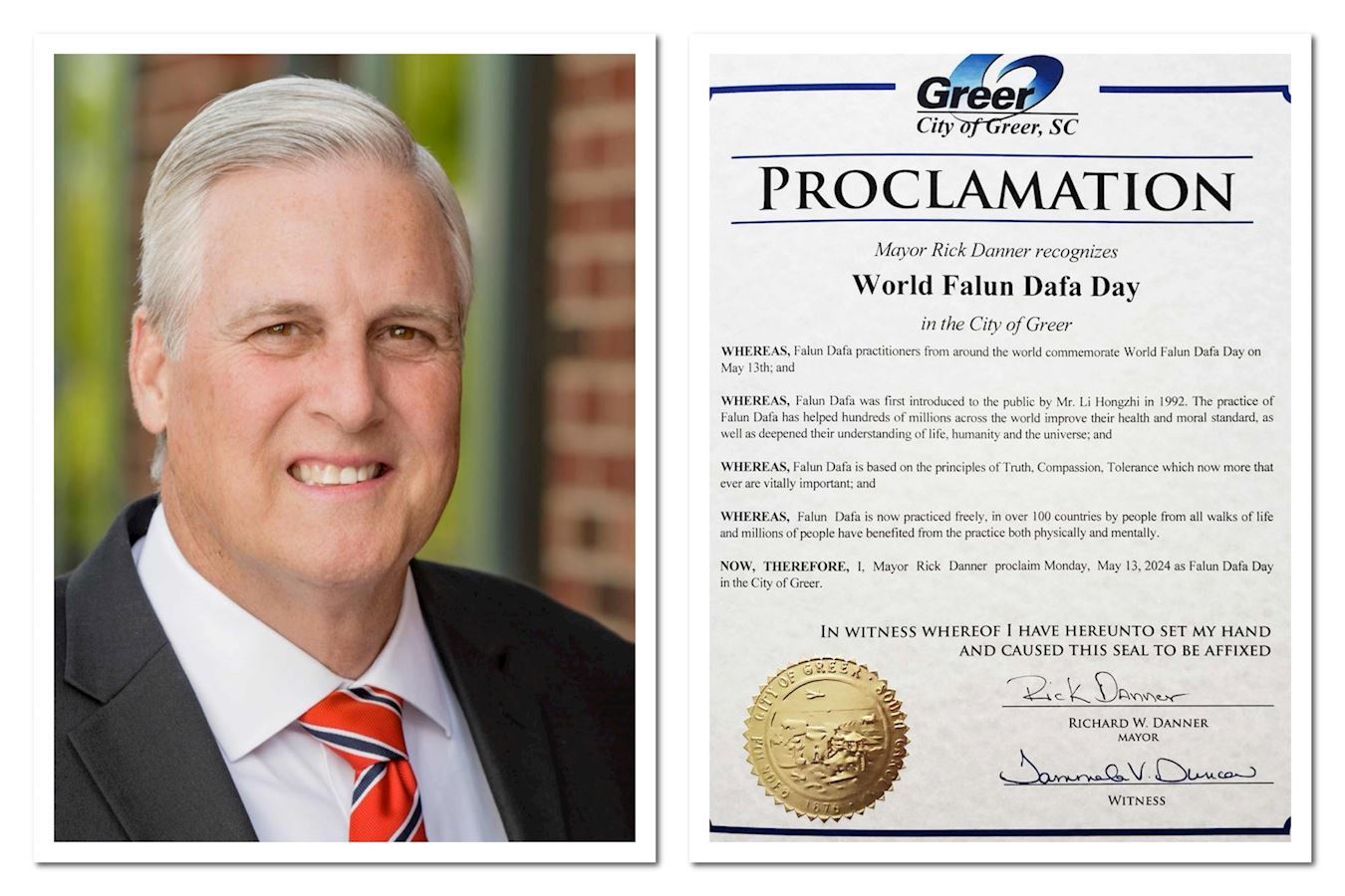 南卡罗来纳州格里尔市市长理查德・丹纳(Richard W.Danner)褒奖法轮大法,宣布二零二四年五月十三日为格里尔市的“法轮大法日”。