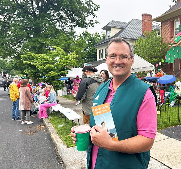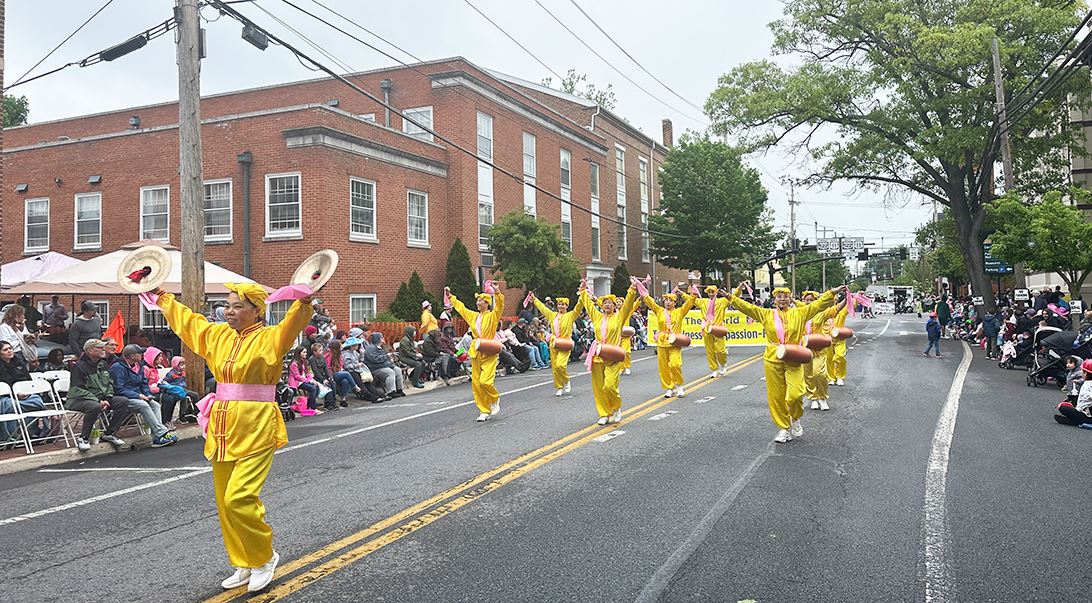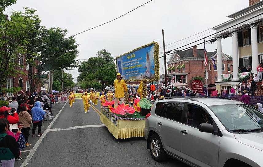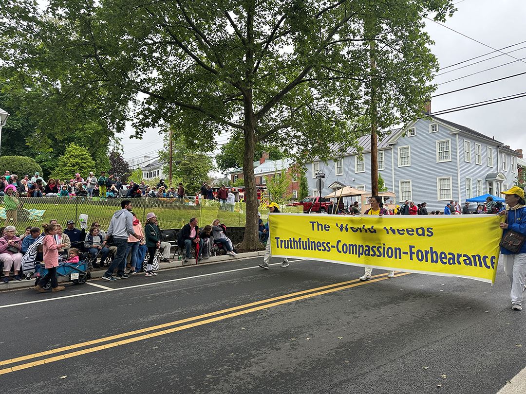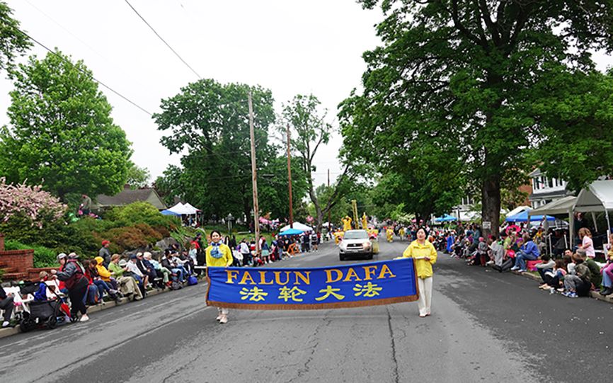 【明慧网二零二四年五月六日】(明慧记者李静菲美国弗吉尼亚州温彻斯特报道)二零二四年五月五日下午三点,成千上万人聚集在弗吉尼亚州温彻斯特市(Winchester)中心,观看苹果花节游行。法轮功学员组成的花车和腰鼓队第三次应邀参加,观看游行的民众被“世界需要真善忍”的横幅所吸引,产生共鸣。