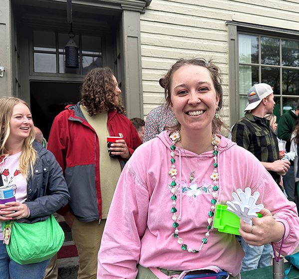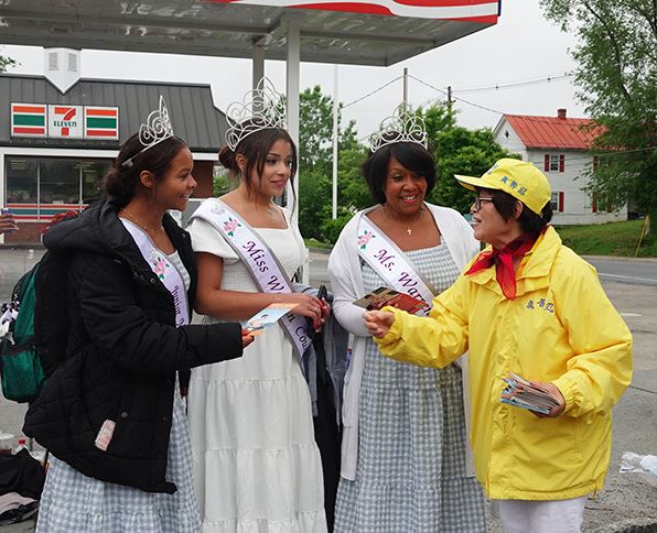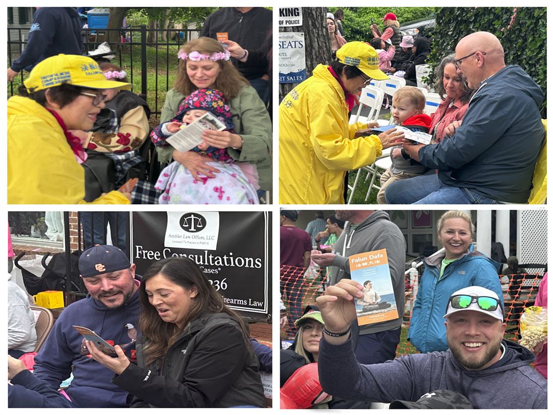 游行开始之前,当詹恩(Jenn)在游行起点看到法轮功学员的游行队伍时,兴奋地跑过来,“我去年就在游行中见过他们(法轮功学员),他们的游行队伍很好,他们都很和善,我很喜欢他们身穿的亮黄色衣服。”詹恩说,她和母亲和儿子从泰国来美国旅游两个月,刚好赶上温彻斯特的苹果花节。詹恩让母亲和儿子站在“法轮大法”横幅前,不停地为他们拍照。