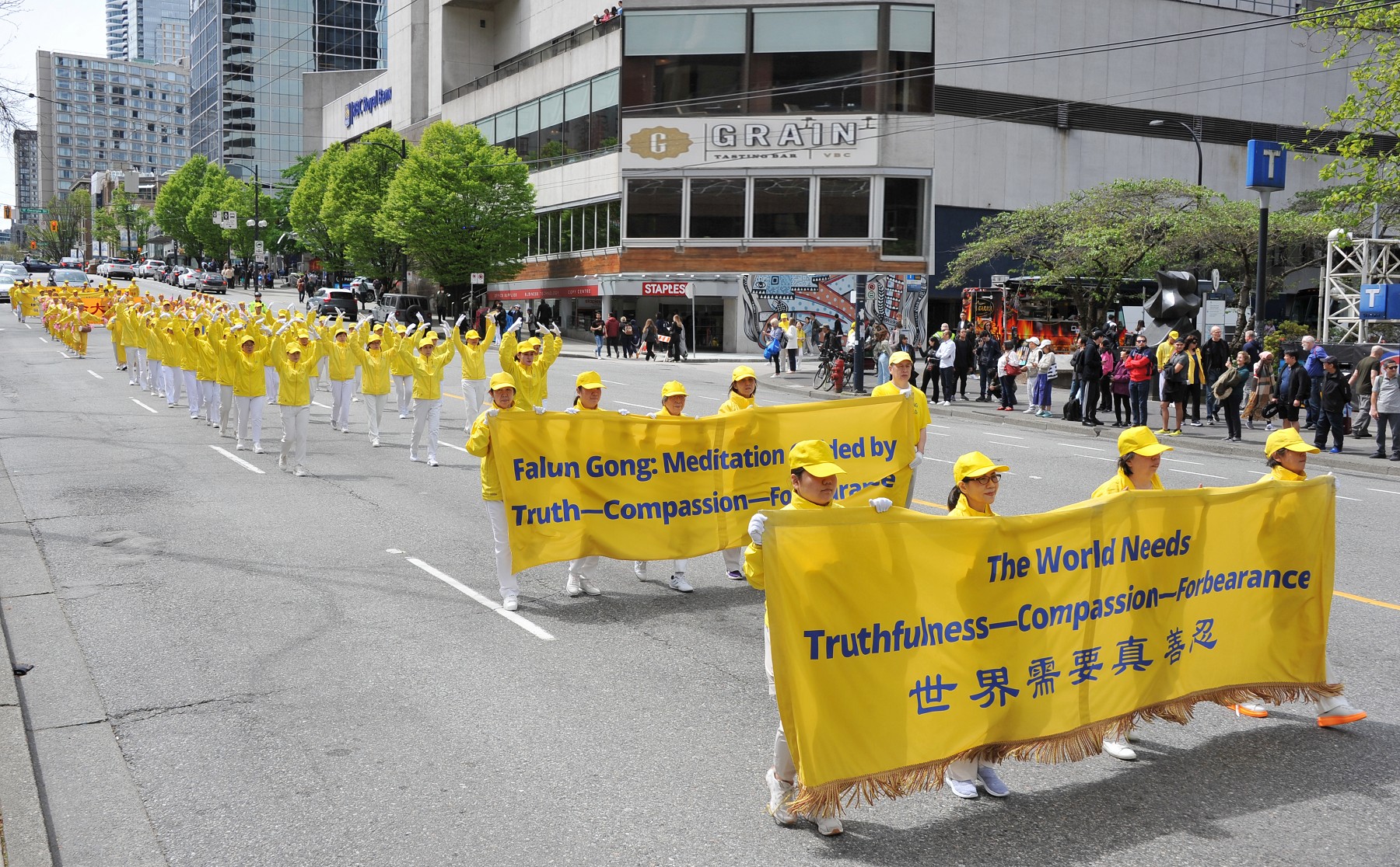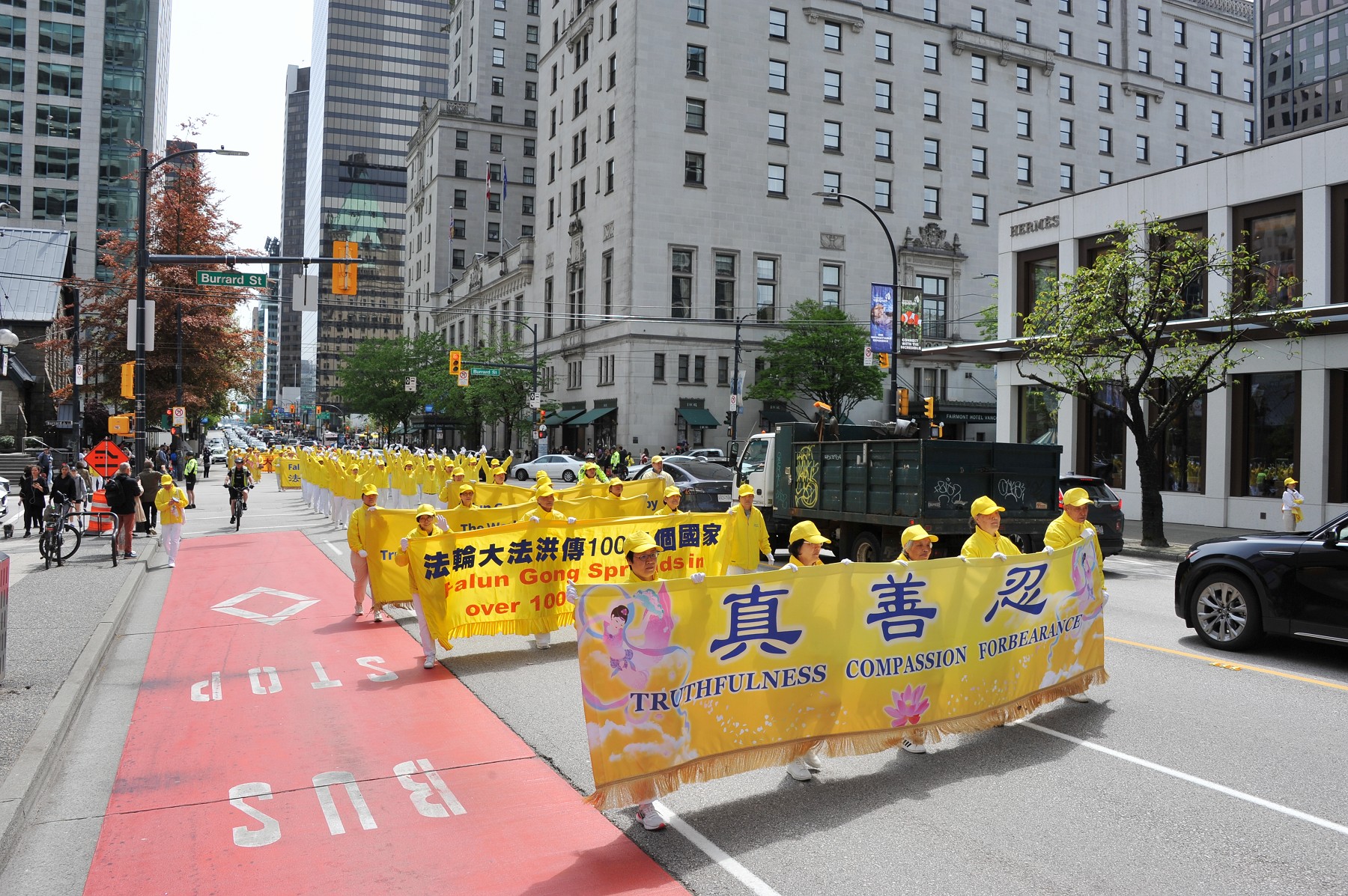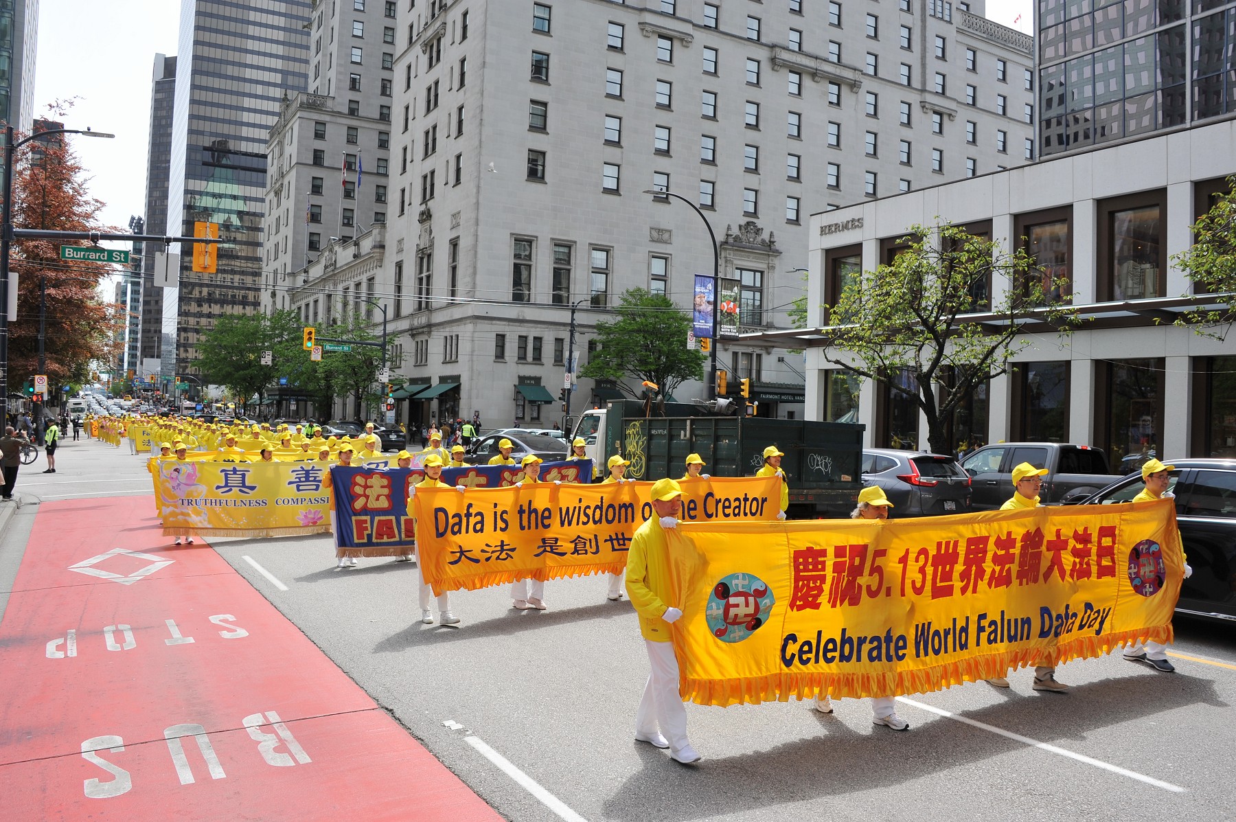 下午一点左右,庆祝法轮大法日的盛大游行正式开始。游行队伍由天国乐团、腰鼓队以及法轮功功法演示队等多个方阵组成,途径温哥华市中心繁华街道及温哥华五帆酒店等地标建筑。