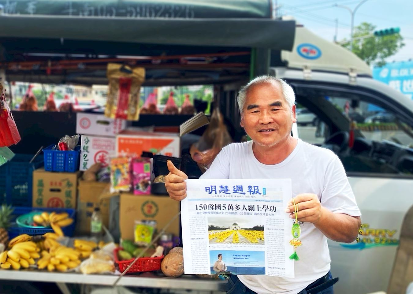 ![]() 图16:摊车零售商杨先生,接下法轮功学员的真相资料,看了觉得法轮功真好,决定学炼。 |