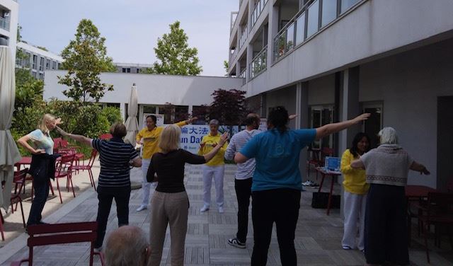 ![]() 图1~2:法轮功学员在法国西部拉罗谢尔(La Rochelle)的博索莱尔老人院(Villa Beausoleil)教法轮功功法。 |