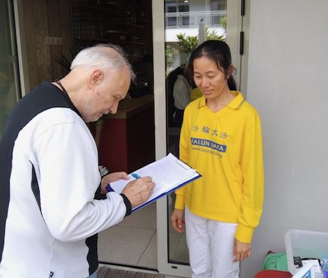 得知法轮功学员在中国受迫害的消息后,人们感到震惊。两位居民立刻问道如何能提供帮助。学员告诉他们可以签署请愿书并向朋友宣传此事,他们立即在征签表上签下了自己的名字。
