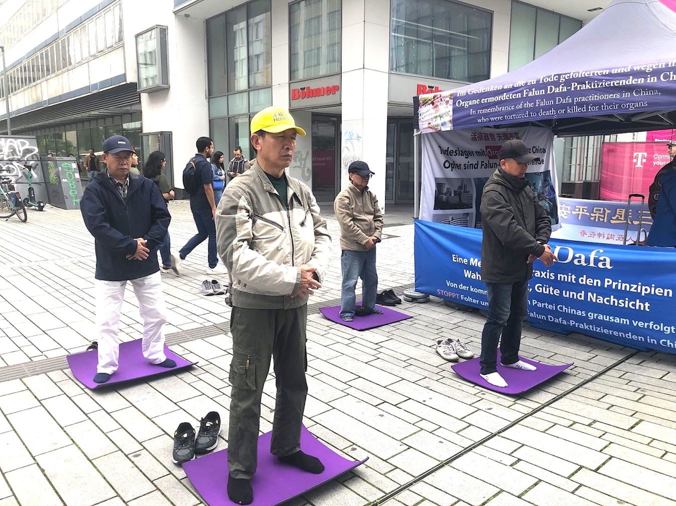 ![]() 图2:六月一日,法轮功学员在杜塞尔多夫的真相点演示五套功法。 |