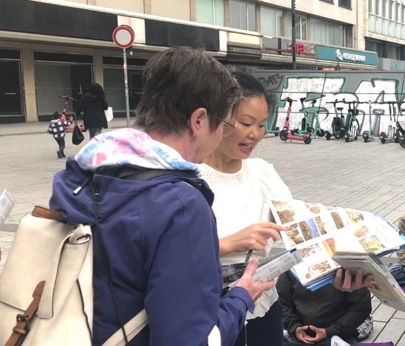 【明慧网二零二四年六月十六日】二零二四年六月一日和六月九日,德国杜塞尔多夫(Düsseldorf)及周边地区的法轮功学员在市中心繁华的步行街上搭起真相点,向人们传播法轮大法的美好及揭露中共的迫害。在这个长期真相点上,不时有西人前来签名声援法轮功反迫害,或了解怎样学炼功法,也有中国人明白真相后声明退出中共党、团、队。