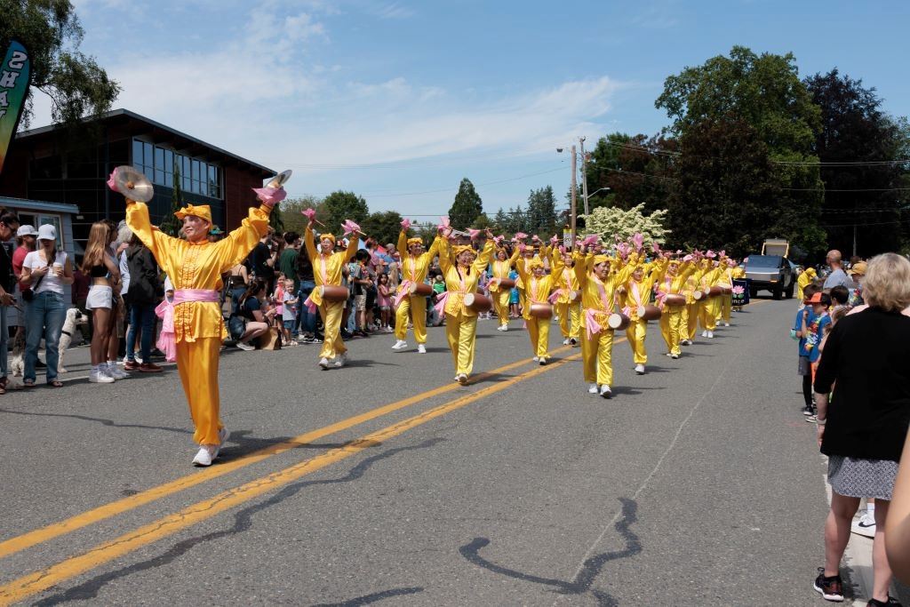 庆典当日,法轮功游行队伍的主体是由西雅图法轮功学员和部分加拿大法轮功学员组成的腰鼓队,伴随着《法轮大法好》的旋律,腰鼓队队员们所敲打出的鼓声整齐壮丽,他们的精彩表演让观众深受感染,掌声和欢呼声此起彼伏。