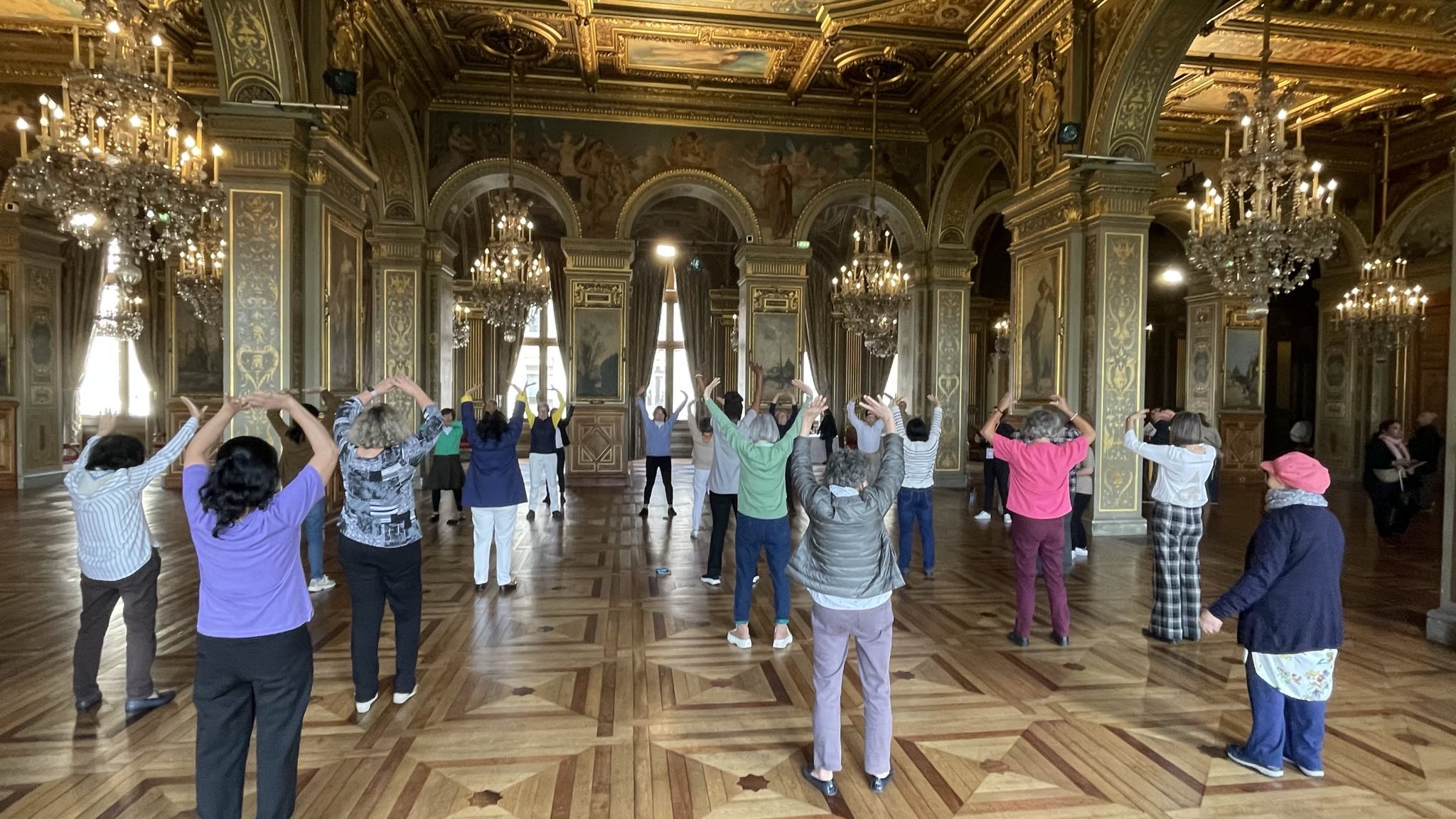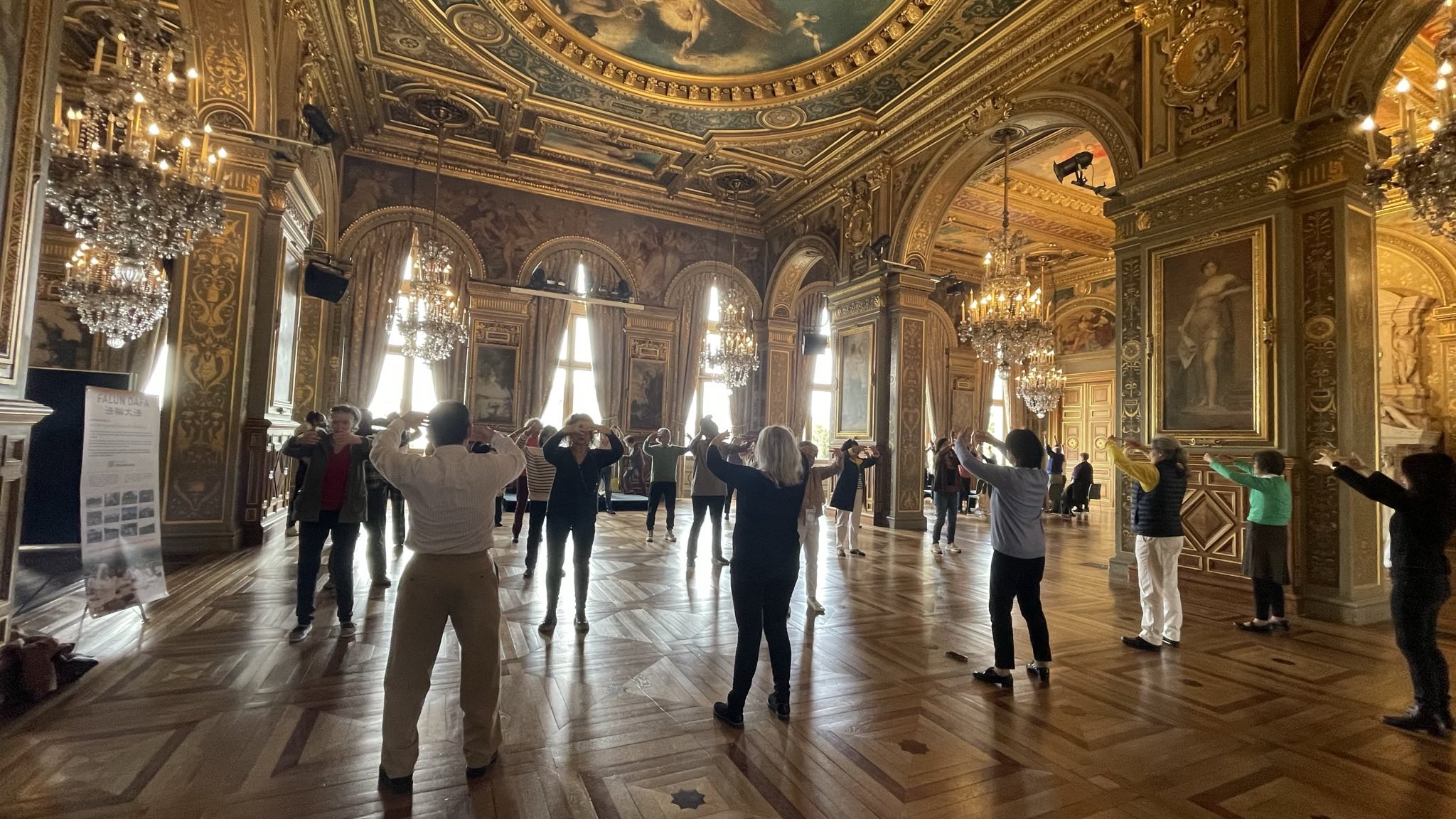 ![]() 图1~3:巴黎市政府邀请法轮功学员参加了在巴黎市政府办公大楼内主办的名为“指导人们美好生活论坛”的活动。图为法轮功学员在论坛现场向民众介绍、展示和教授法轮功的五套功法。 |