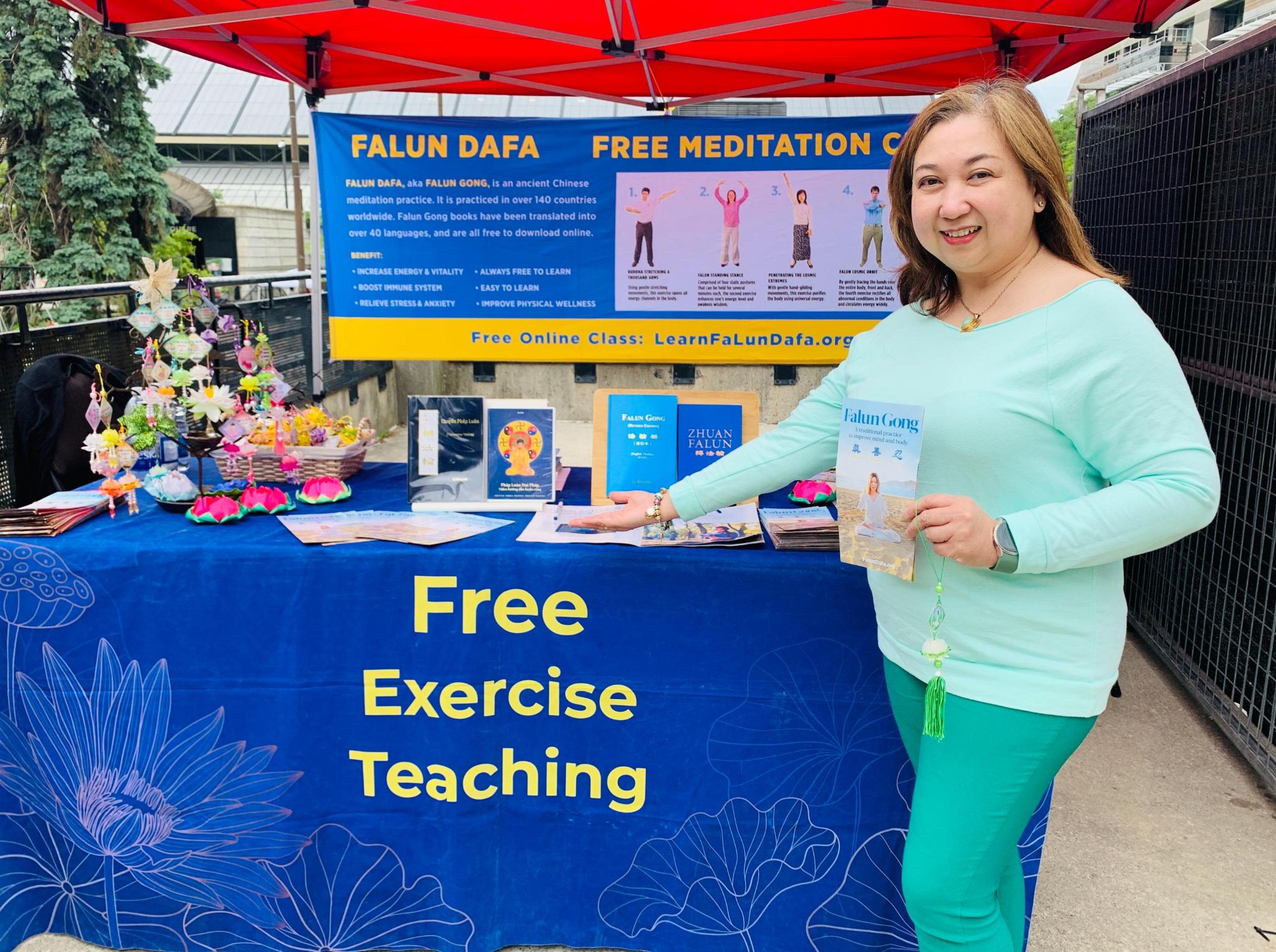 瑟琳(Celin)也是第一次听说法轮功,经过学员对大法的介绍,她知道了法轮大法真、善、忍的修炼理念。瑟琳说:“这三个字中,‘忍’是很特别的,我喜欢和认同这三个字。回家后,我也会到大法网站了解更多。”