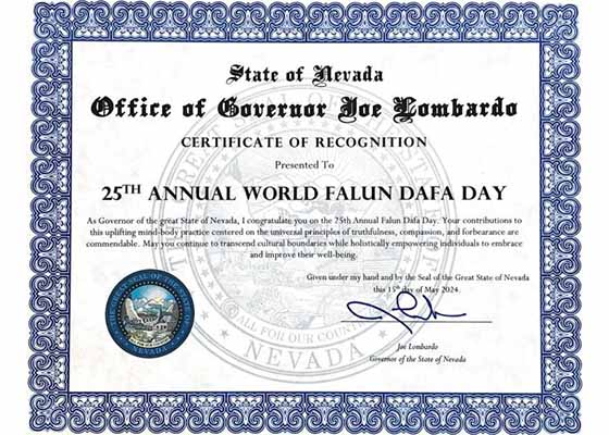 美国内华达州的内华达州州长、副州长和卡森市市长为法轮功创始人李洪志先生颁发褒奖状,感谢他为人们身心健康作出的贡献。