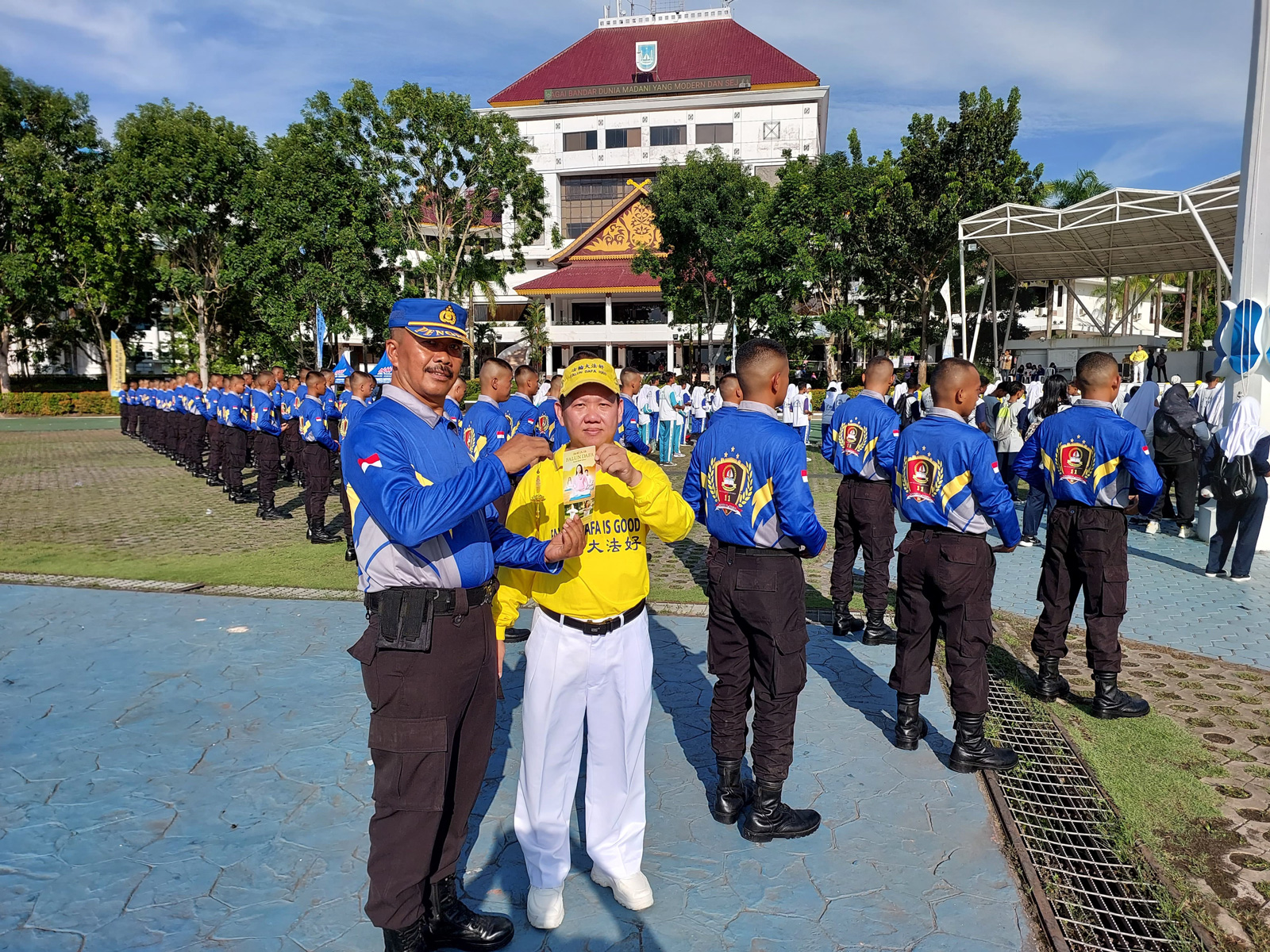 活动结束后,巴淡市地区秘书叶弗里丁(Jefridin)和巴淡市青年和体育局局长祖尔卡南与部分法轮功学员合影留念。