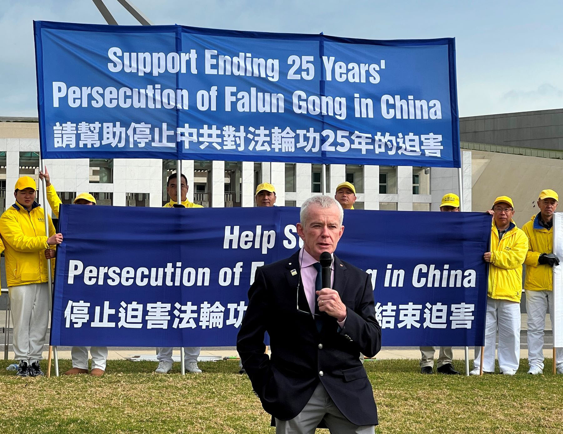参议员马尔科姆・罗伯茨(Malcolm Roberts)在集会上发言时表示,同情法轮功学员遭受的迫害,“我首先对你们所承受的一切表示同情。我知道你们在中国的亲人正遭受拘禁和折磨,我也知道你们中有人曾经受到迫害酷刑。”