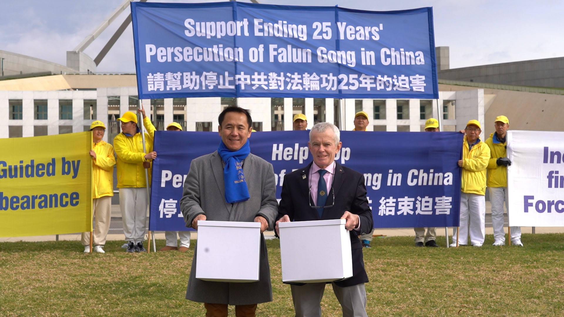 法轮功学员近期向各界澳洲民众征集请愿书的签名,请愿书呼吁政府帮助结束中共对法轮功团体迫害的。当日在集会上,法轮功学员向两位联邦参议员提交了约二万四千个签名的请愿书。