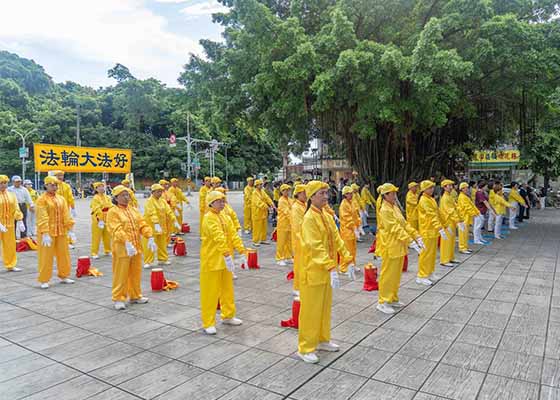 七月七日下午,高雄法轮功学员来到莲池潭景点炼功弘法,向市民传递法轮大法的美好,其中包括腰鼓队表演,以及法轮功五套功法演示。