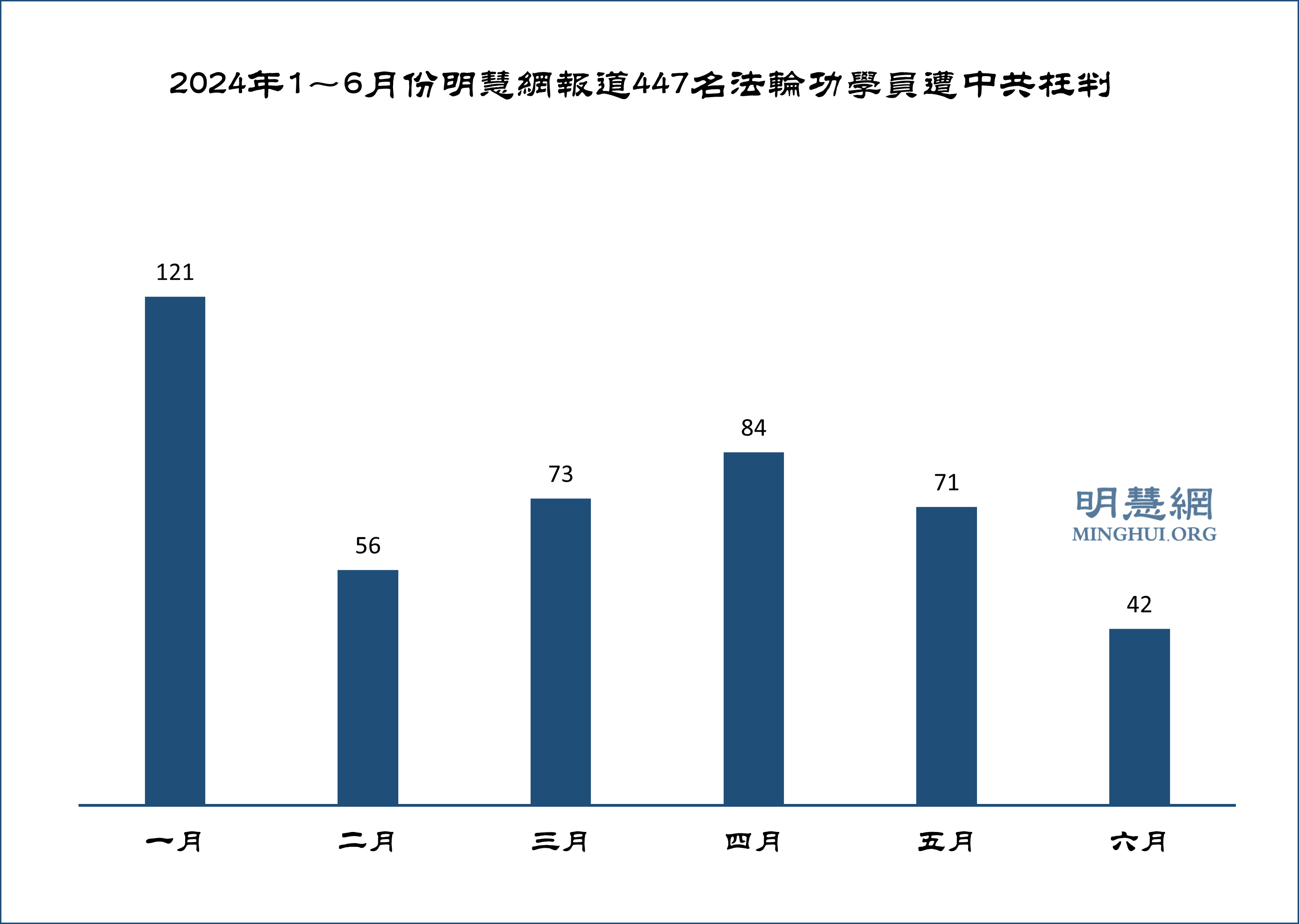 ![]() 图1:2024年1~6月份明慧网报道447名法轮功学员遭中共枉判 |